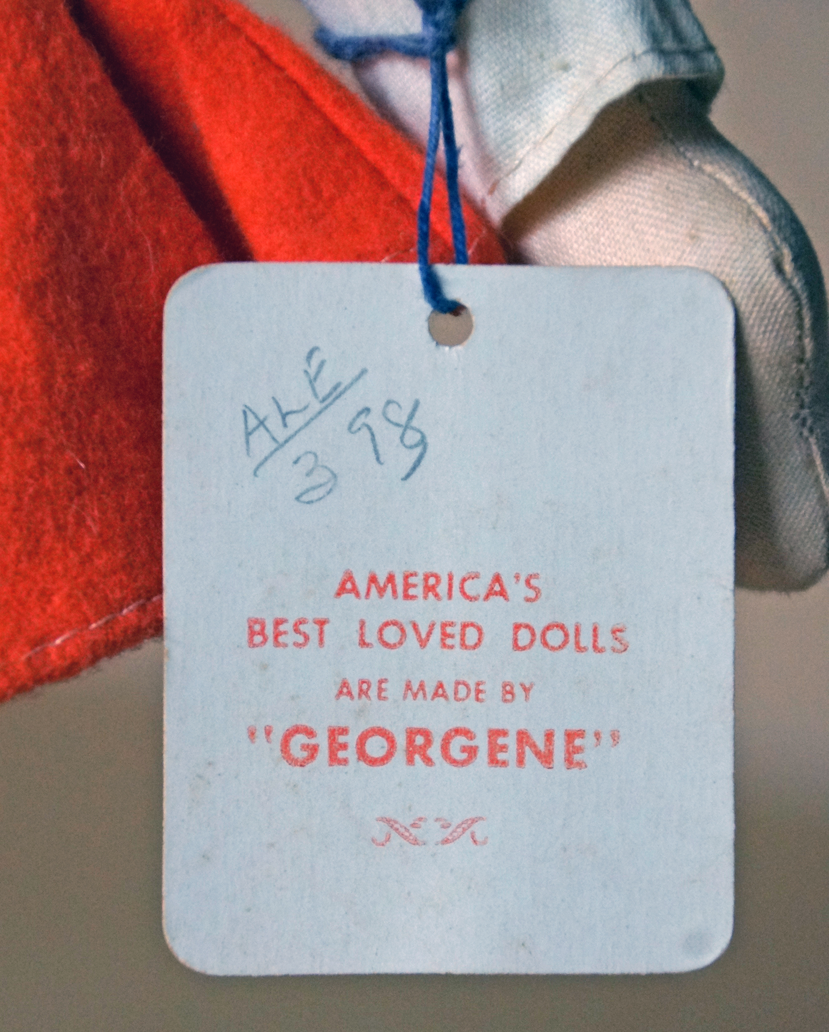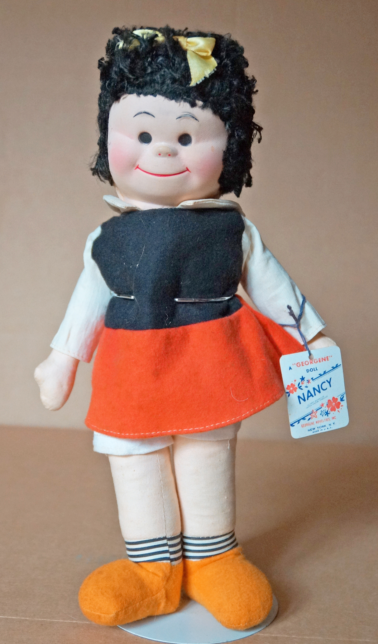 14″ (35 cm) American cloth girl made circa 1940’s by “Georgene Novelties” representing the (United Feature Syndicate) comic strip character “Nancy” created by Ernie Bushmiller. She has a swivel neck on a cloth torso with sewn joints and shoulder and hips. The one piece arms have attached “mitten-style” hands, and the straight legs have sewn on black and white horizontally stripe ankle socks tops with orange felt covering over the feet to simulate shoes. The dress is made in one piece with white linen arm sleeve and collar, and black felt top and orange short skirt. Nancy’s face is hard pressed cloth with “button” nose, a tight lipped red smile and nostrils highlights, black arched eyebrows, and indented black pupiless eyes. The back yarn wig is sewn on to the head with a yellow silk ribbon bow as part of the wig. An extra feature is the original cardboard swing tag with all the printed identifying marks and attributions already stated above. In overall good condition with very minor surface dust primarily on the shoes. US$ 125.