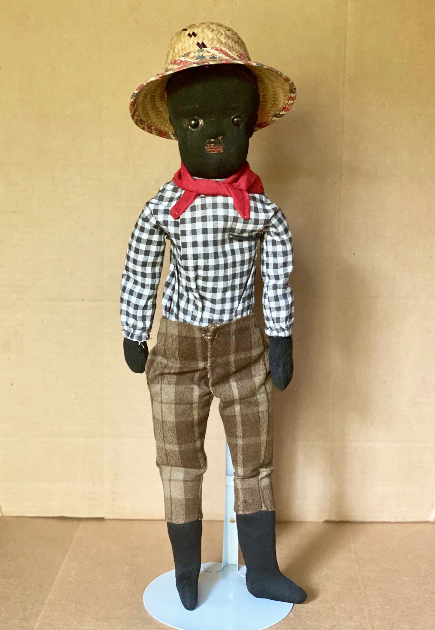 19” cloth doll with stockinet covering known to the doll collecting world as a “ Black Beecher-Type” as it is made in a similar manner to the “ Beecher Babies “ manufactured around the turn of the Twentieth Century in upstate New York but there is no evidence that Julia Jones Beecher of Elmira NY ever directly made or sold the more elongated black children of which this doll is well exemplified. Regardless of the ambiguity/uncertainty of exact source of manufacture these dolls are highly regarded in their own right and stand alongside both in terms of respect and approximated price range of the “ Missionary Rag Babies “ of Mrs. Beecher. As is typical, this doll has a stockinet covering over the molded head and facial features, a tight wooly caracul wig as part of the doll, and black pupiless eyes backed by a white celluloid-type material. Lips and nostrils are painted bright red , hands are “ mitten-style “, and there are sewn joints at shoulders ,hips, and knees. This doll is dressed as a “country boy “with plaid cotton shirt, plaid linen trousers, a red neckerchief, and a multicolored woven straw hat. Although he does have some anticipated age wear, he is still in relatively overall good condition compared to most and priced accordingly to reflect his actual physical status. Those in excellent to near mint condition usually sell for at least 30-40% higher…………….US$ 995.