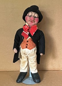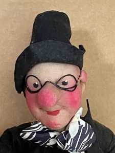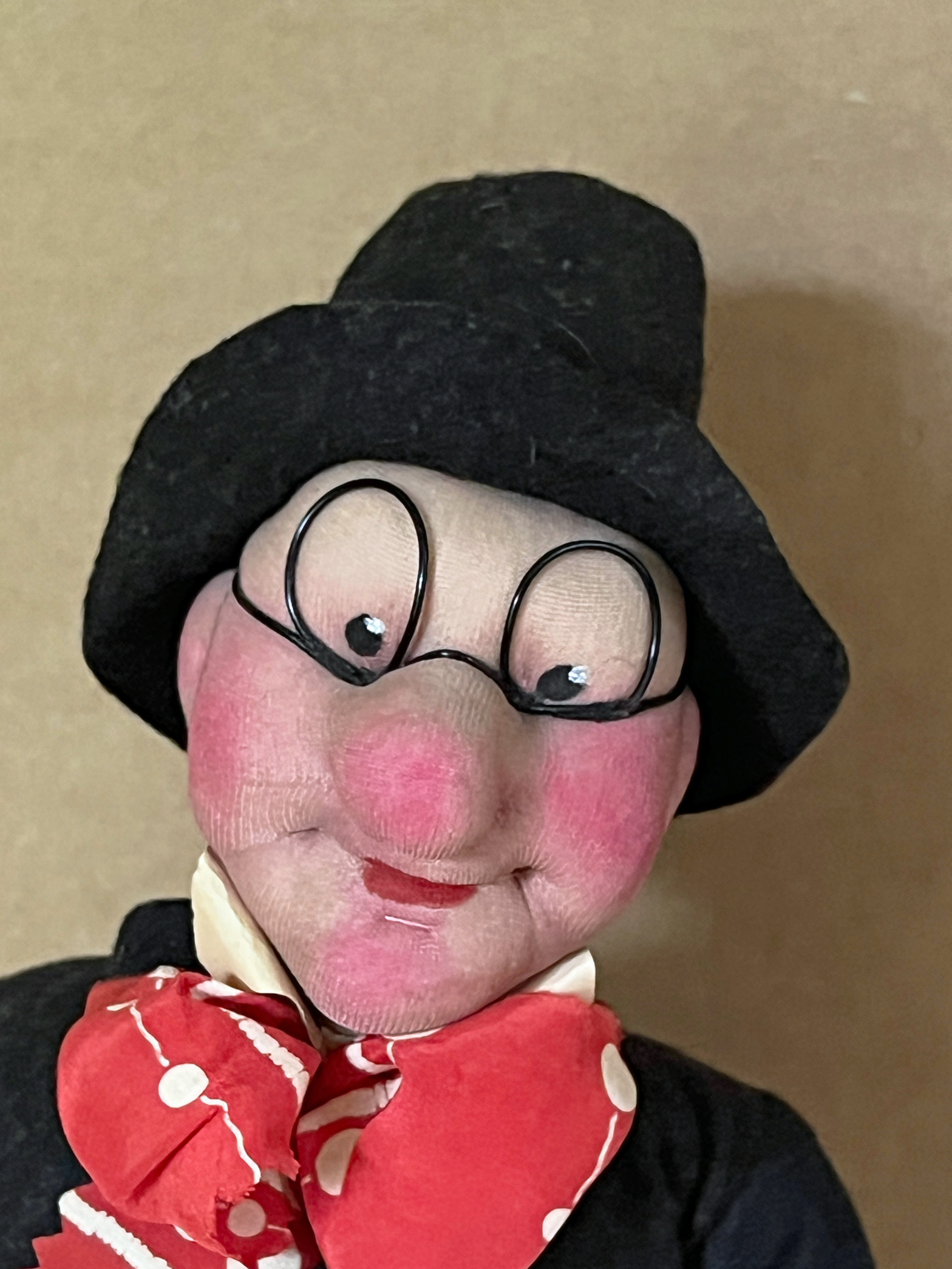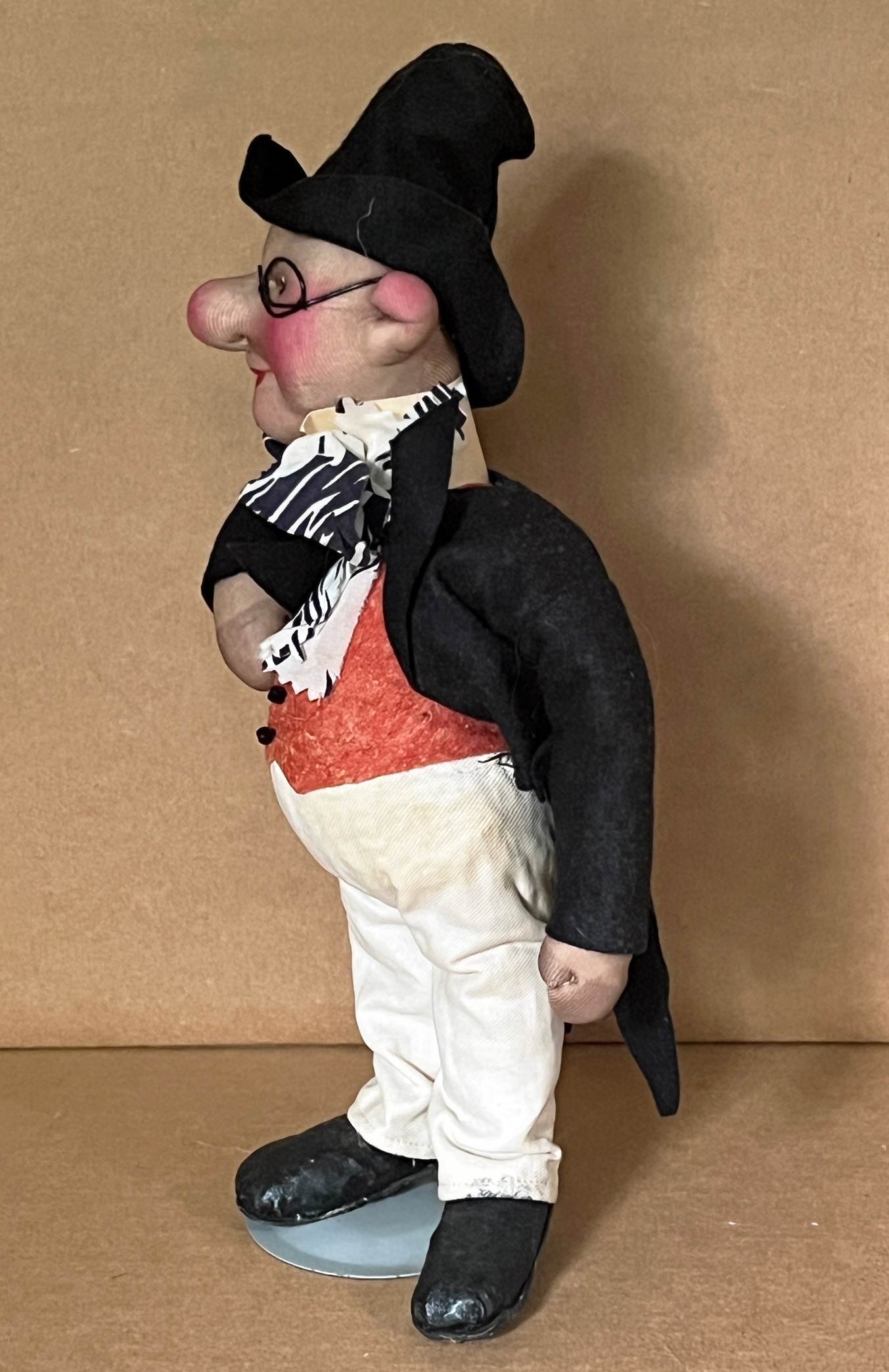 Rare 12”( 31cm -to top of hat ) Ravca stitched cloth man with black top hat and spectacles, with right hand tucked into his vest pocket. All clothing and accessories are stitched permanently to the main figure as are the glasses frames. His large kerchief black and white print oversized bowtie also has a stiff white collar obscuring the cloth behind neck. His face looks onward with a slight tilt to his right side. On the outside of one coattail is stitched a cloth tag “ MADE IN FRANCE “. His large red swollen nose is reminiscent of that of W.C. Fields whose fame was at its zenith at same era of production of these figures. A charming rarely found character surely with his own special name unknown to us……………..US$ 125.