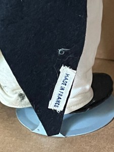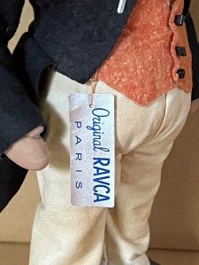 Although not remembered to have been seen by us before, here we have another version of the rare and eccentric 12” ( 31cm ) male gentleman also with the same cloth “ MADE IN FRANCE “ tag sewn to the coattail but ALSO maintaining a rectangular paper tag with silver foil surface in front reading “ Original RAVCA Paris “; and, on reverse side, written in cursive ( although second word hard to read ), “ Professor “ Nimbug (????)”. He, as is his friend, is rather formally dressed with black hat and waist coat with long tails in back, glasses frames attached, but with his gaze looking evermore slightly to his left. His clothing is almost identical to that of his compatriot, however with a large red and white oversized bow tie………..…..US$ 125.