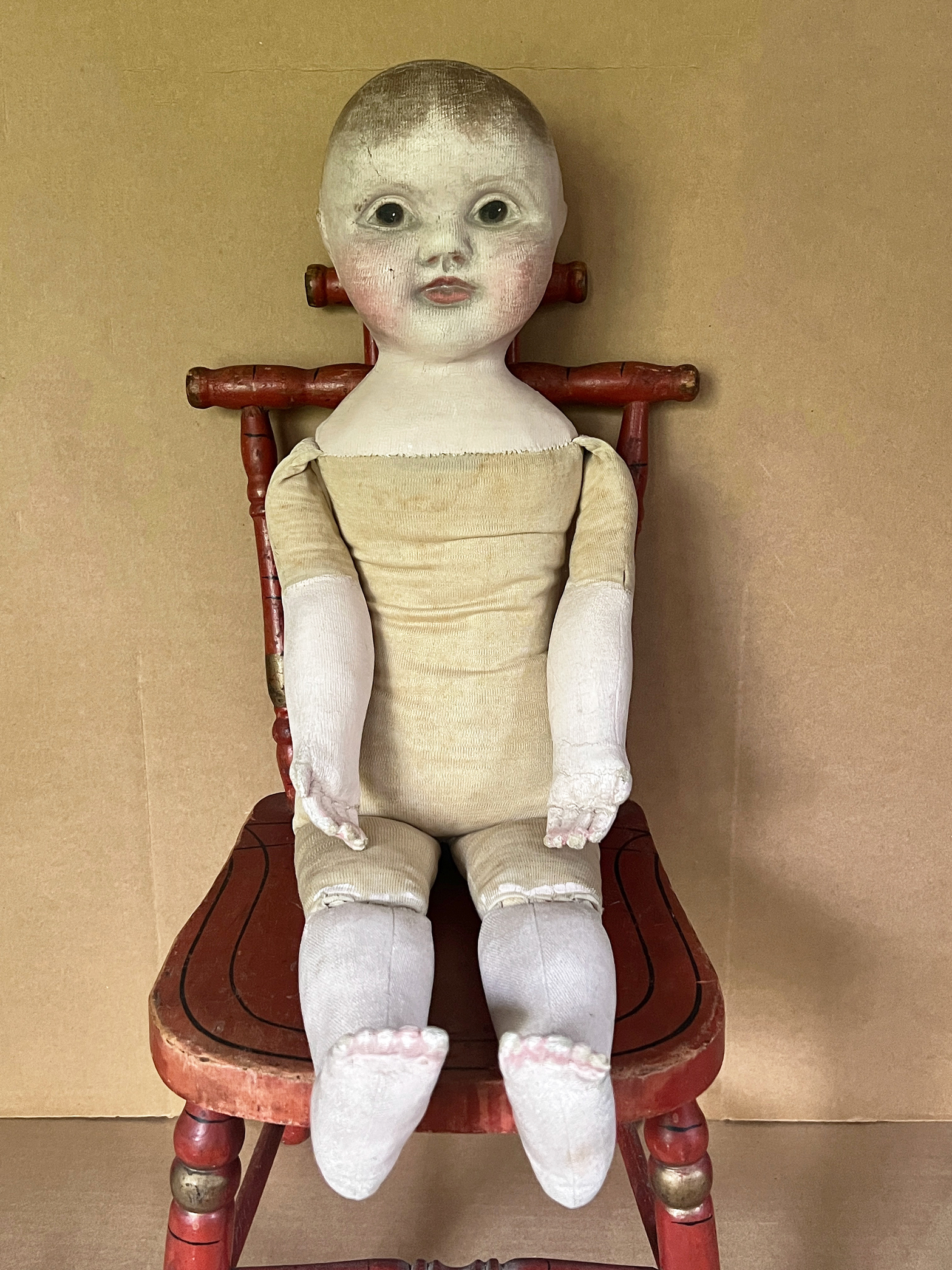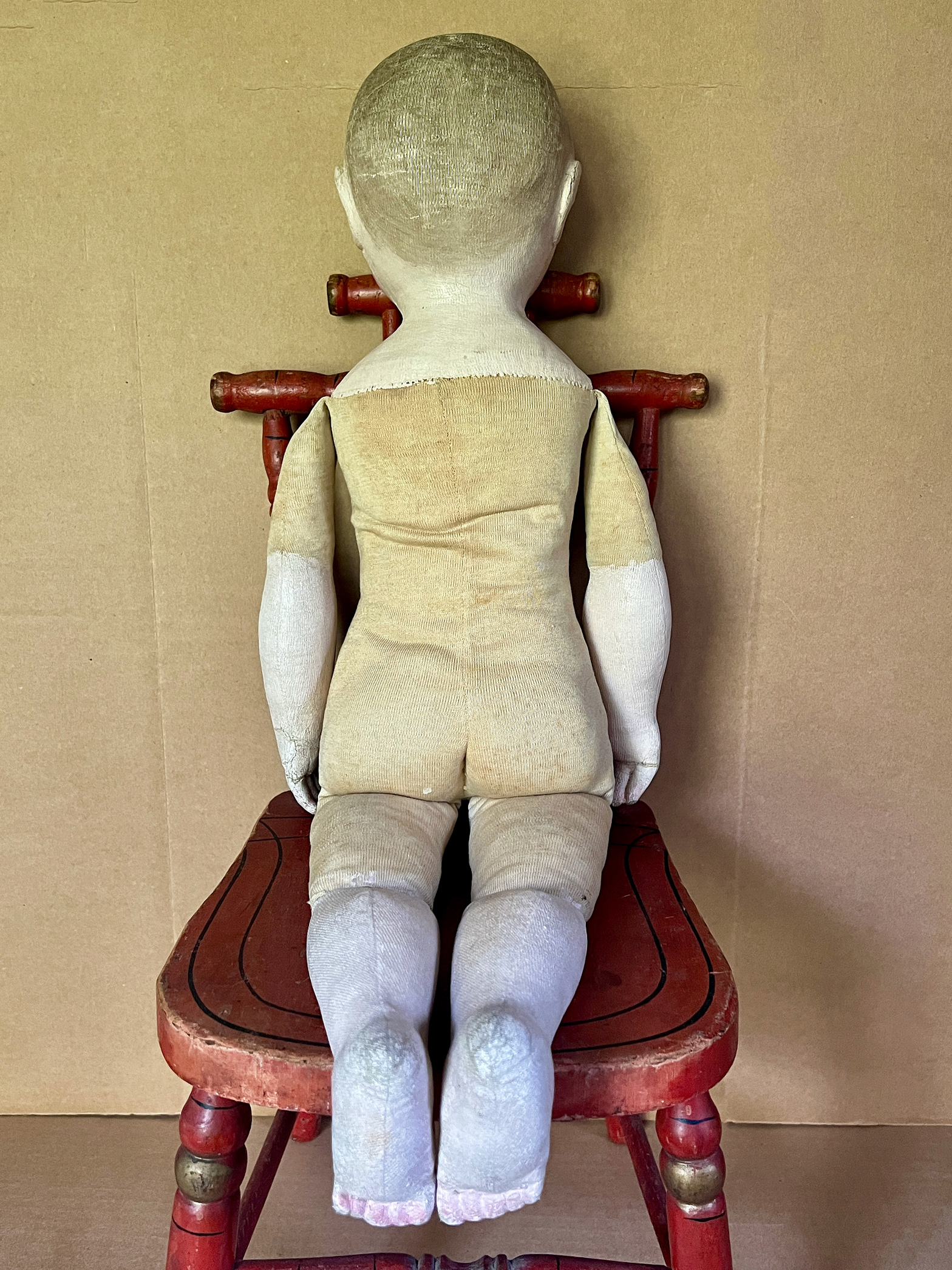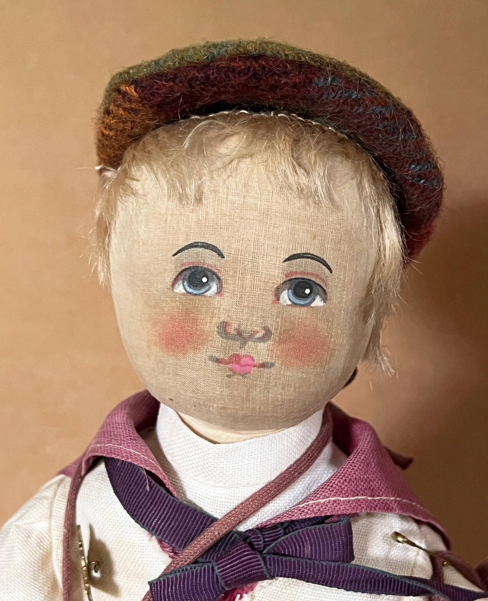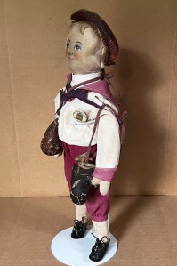 This 15’ ( 38cm ) American cloth “ Babyland Rag “ doll has about as much appeal and personality as any we have seen to date. Boys in general from this firm are much more difficult to find than girls, and furthermore this early example has the “painted silk “ face, still in excellent condition, with wisps of blond human hair poking out onto forehead and all around from underneath the ( slightly faded ) plum wool cap. The original sewn-on costume consists of a cream- colored linen shirt with starched high collar, plum linen trousers, sailor-type collar, purple tie that is hidden under the collar while tying in front, white knit socks, and black canvas shoes. As he appears to be a boxing enthusiast, he has antique leather covered boxing gloves, and a leather covered punching back. Pinned to his shirt is a brass pin with a large red letter “A”, and also a metal advertising button stating “ The World’s Best Varnisher “. The exact maker of the advertised varnish is unknown. A great piece with lots of accessories and loads of charm!…US$ 775.