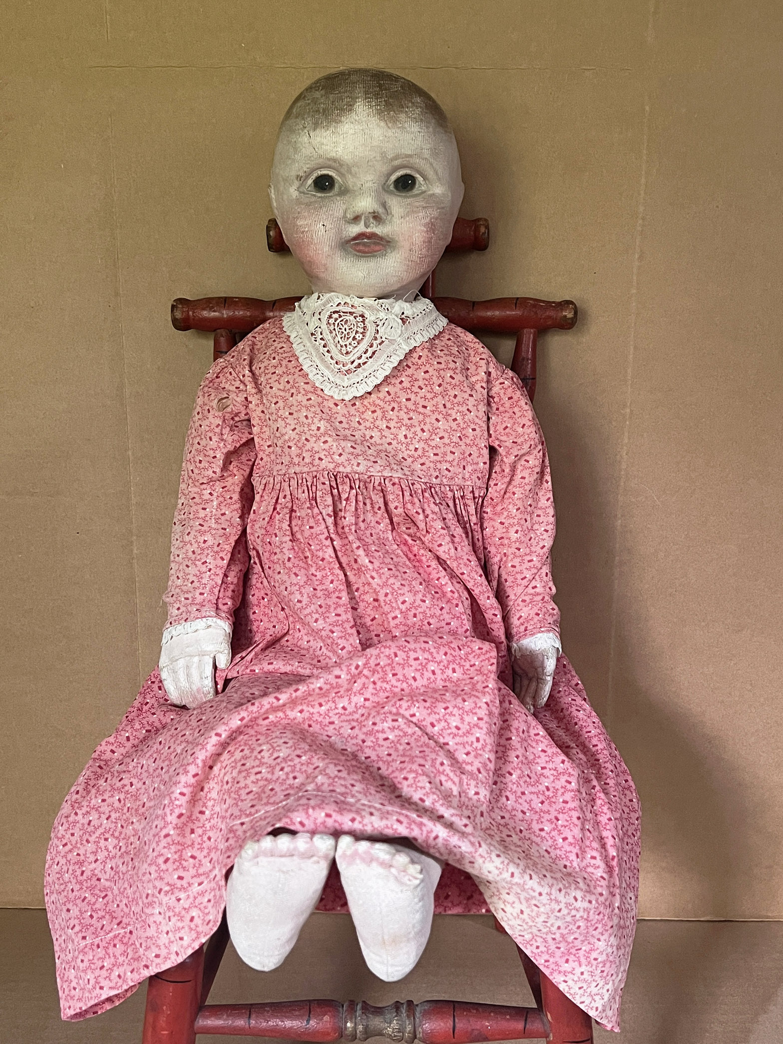 Exceptional 21” ( 54cm ) example of the Sheppard Baby, aka the “ Philadelphia Baby “, circa 1900, with head and shoulder molded and painted oilcloth, exhibiting remarkable three-dimensionally rendered facial features, all hand painted allowing for similar but distinctive personalities with each and every individual doll. The eyes must be considered the most realistic of the features as they are deeply indented with intaglio painted precision, white highlight dots in pupils, as well as individually molded upper and lower eyelids. The mouth also has a deep indentation with realistic molded lips which are delicately painted and shaded. The separately modeled ears are delicately blushed and the short babyish hair, quite wispy, with emerging short bangs. The head and shoulders plus the lower arms and legs are all similarly constructed and painted with special attention given to the formation and highlighting of the nails on the extremities. The torso, upper arms and legs are covered by a light stockinet-type thin cloth. The cotton print dress is most likely original or, at least “of the period “, as are the simple undergarments. There is no repaint or repair anywhere on the doll, only slight fading over time, but in an overall uniform manner and consistency. A wonderful example and offered at a modest…………….US$ 1,450.