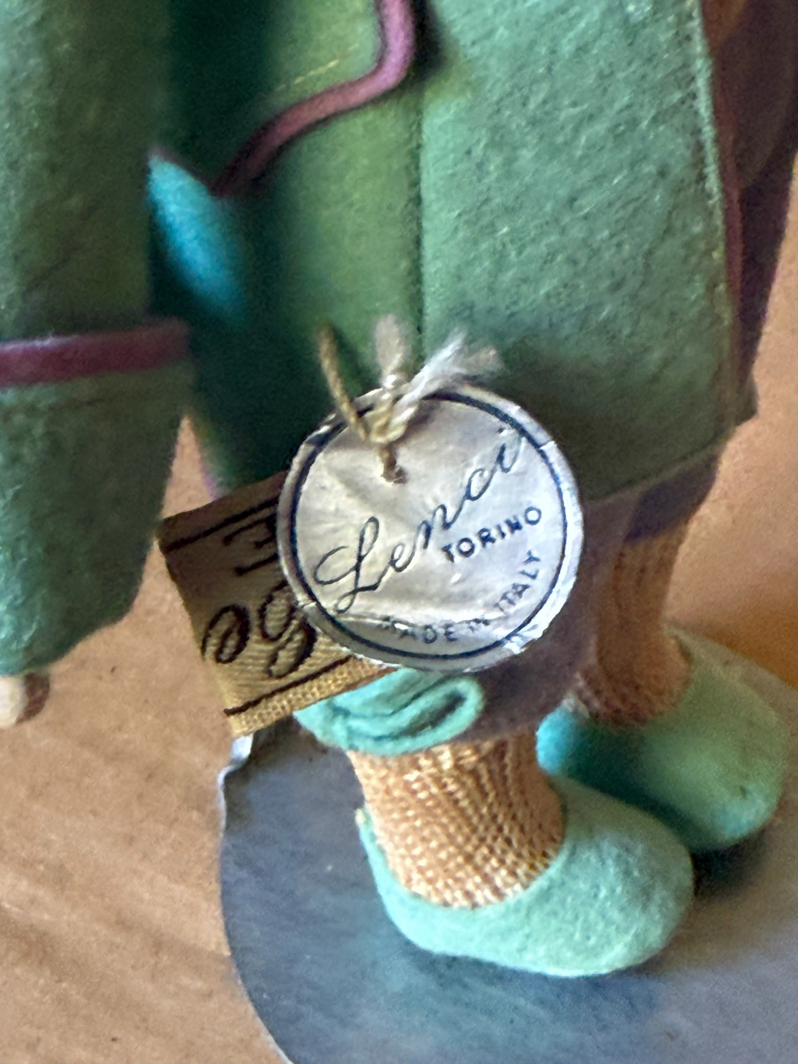 Lovely, desirable, and all original 9” (23cm ) Lenci miniature ( so-called “Mascot ) in very clean overall condition, with almost no surface dust or fading with age. Sewn to the lower right side edge of the jacket are two Lenci identifying items, a folded -over cloth banner reading “ Lenci Made in Italy “, as well as a silver foil round paper tag ” Lenci Torino Made in Italy “. His hair is a one-piece yellow felt cutout with comb marks in front edge framing the face, rolled -up curls covering the ears, also in back of head, and terminating in center of neck is a long and wide braid folded up and tied at neck level. His mid-to-late 18th Century costume consists of a pale green felt jacket, open in front, and lined with light plum felt which is also used to trim the tops of his oversized folded up sleeves. Under the jacket is a light ivory felt fitted vest with applied colored felt flowers, a cotton gauze kerchief, with likewise fitted high neck collar. The mid-ankle length trousers are of dark lavender felt with light green bows at the sides at knee-level. The shoes are green felt slippers that match the jacket, with tight- knit high stockings covering remainder of legs. Tucked under his left elbow and pressed in place against the jacket, one will observe his original felt tri-cornered light gray felt hat. What more might one expect for a ninety-year-plus-old doll ?!…………US$275.