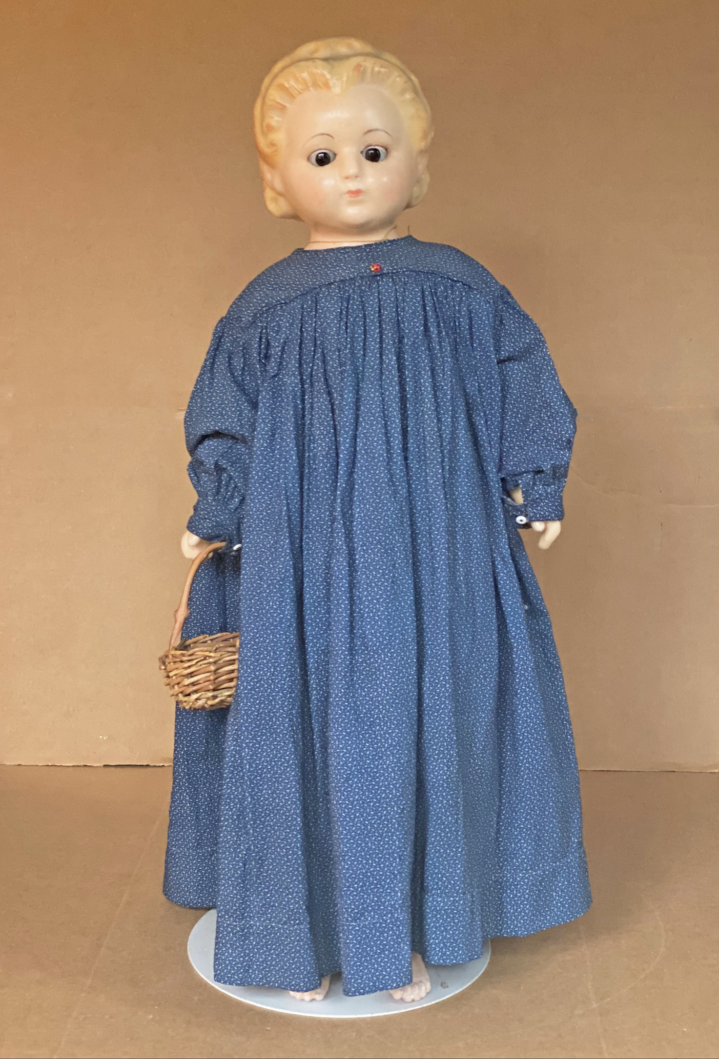 Charming 24” ( 62cm ) German wax-over-papier -mache shoulder head doll with glass eyes, molded yellow hair with blue headband in the generic style referred to as the “ Alice”-type that was represented in dolls made in a variety of materials including china, parian, papier-mache and perhaps most desirable the“ Motschmann”- style porcelain dolls. This sweet 1860s era doll has a muslin covered stuffed body with sewn joints at shoulders and hips, composition lower legs, and heavily wax coated composition lower arms in similar manner as the head. In additional to antique undergarments, she wears a dark blue cotton print period dress whose coloring helps accentuate the blue in the molded head band. The glass eyes are not sleeping at this time but most likely did originally. As we have not attempted ( nor will do so ) remove the head, we cannot say definitively whether the eyes have been reset in the stationary position or, if the eyes can indeed still sleep but the head cavity has been stuffed from the bottom up. Regardless she is in relatively good condition for a doll of this age and these materials!…………….US$ 235.