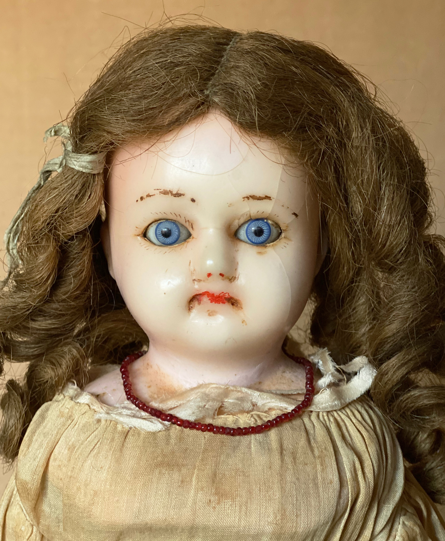 Charming 16” ( 41cm ) 1880s era German wax-over-papier-mache shoulder head doll with blue glass sleep eyes, a closed mouth with slight fretful expression, head mounted to the original muslin covered stuffed body with nice white kid forearms with individually stitched fingers. There are sewn joints at shoulders, hips, and knees which allow her to be seated if desired. Tied to her solid dome head is the original brown human hair wig still retaining all its long “ sausage “curls with one on right side of head tied with an antique silk ribbon. The simple period clothing appears likely to be original and consists of a one piece gauzy muslin dress in an “ off- the- shoulder” style, high narrow waist, and silk ribbon bows at ends of both sleeves. Underwear consists of two full cotton slips, the outer slightly longer than the inner, with a third “onesie “ clinging to the body all the way to the knees. She has no socks nor shoes. Around her neck she still retains her period small red glass bead necklace. Overall condition is very good considering age and type with a few typical crazes to outer wax primarily above the eyes. Simple but sweet and all original!……………………………………….US$ 225.