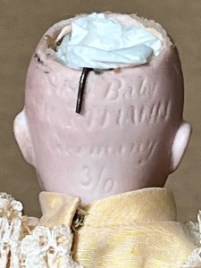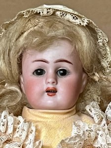 Knowledge of dolls would make one assume that this 8” ( 20cm ) doll was probably made by Simon & Halbig and indeed it most likely was, however, most likely, they were subtracted by the design/patent owner as incised on back of head “ C HARTMANN Germany 3/0” and then the incised trademark “ Globe Baby “! She has brown glass sleep eyes, an open moth with four upper teeth and is on the original five-piece composition body with chubby lower legs with molded and painted long black ribbed stockings and brown two-ankle strap shoes with separate low heels. She has her original long blond mohair wig covered by an antique white gauze mop cap and has been lovingly redressed by a prior owner in custard yellow 1910-style costume with lace trim throughout and, a chartreuse ribbon sash ribbon at the waist. A hard-to-find doll in very nice condition with great appeal!………….US$ 95.