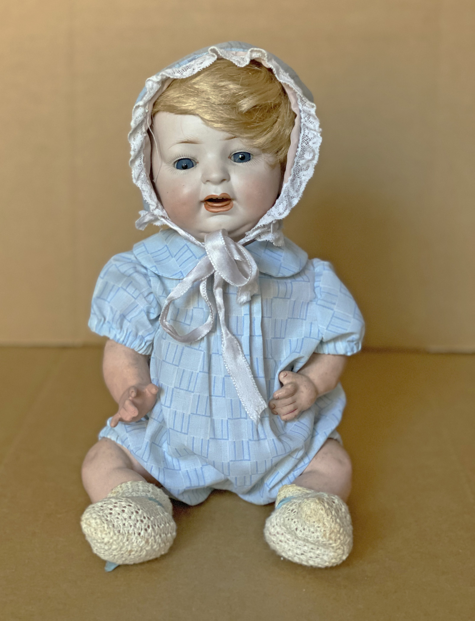 15” ( 38cm ) baby attributed to Hertel and Schwab and incised “ 152 7 “ with vey pale smooth bisque, blue glass sleep eyes, upper and lower tiny lashes, multistroke “ flyaway “ brows, and an open mouth with separately molded tongue tip affixed to lower lip, a protruding upper lip with four molded teeth on top. The bent limb composition body is original with overall good original finish throughout. He/she has been well costumes in a blue based cotton print romper suit with blue lace trimmed bonnet that ties under the chin. Blond wig is human hair but newer than the doll……………………………..US$ 65.