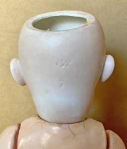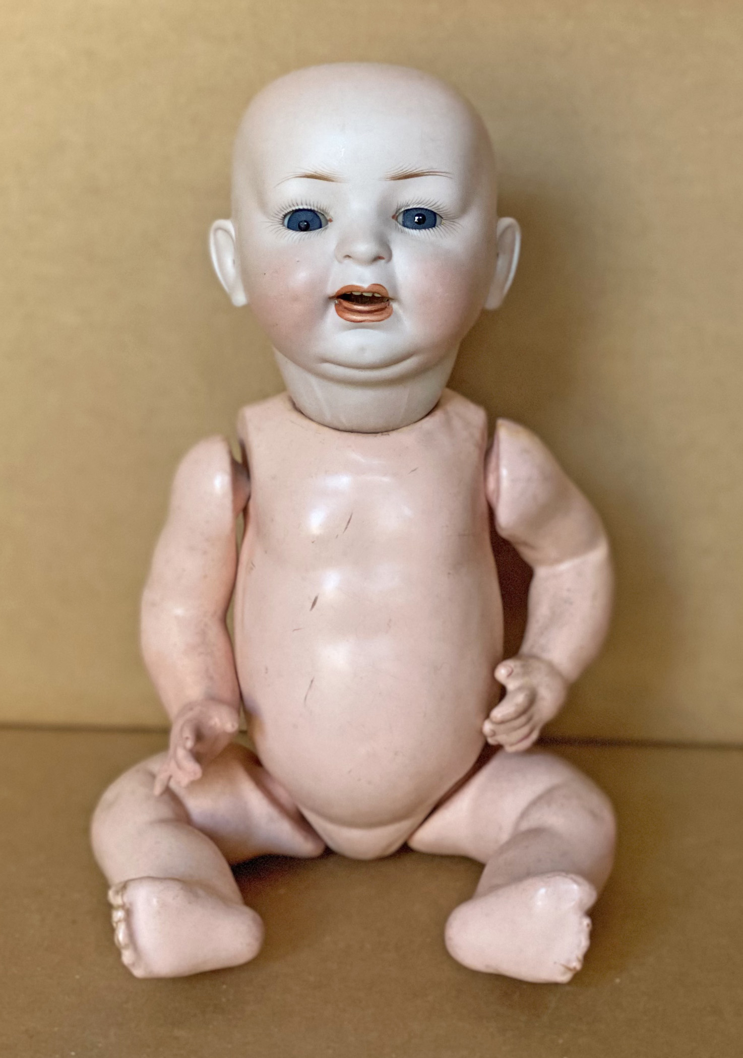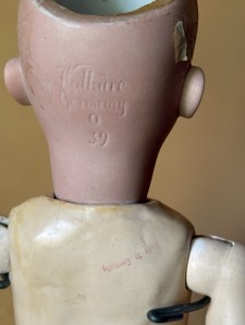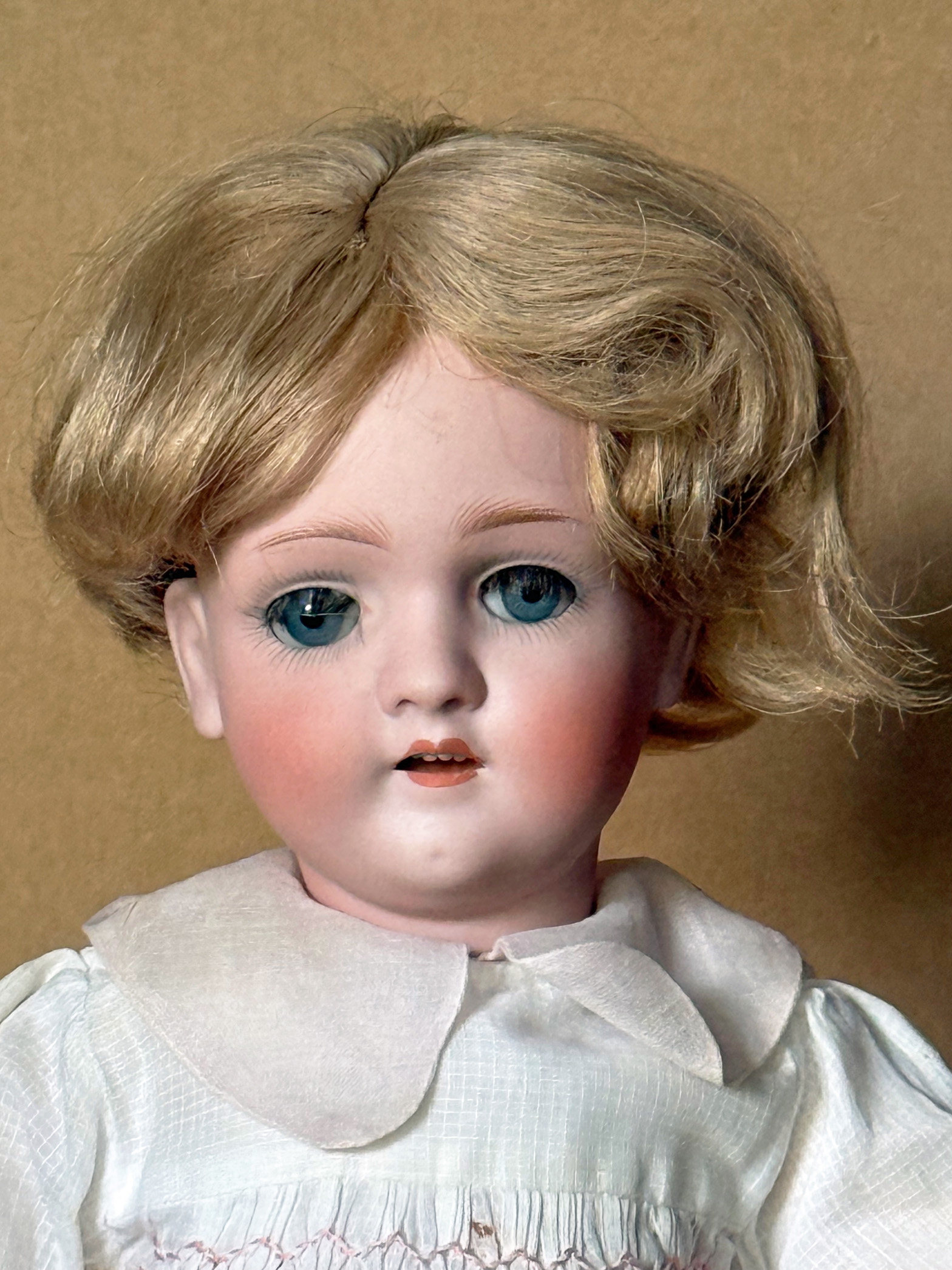 Desirable size ( 15 ½’’, 39cm ) |dolly-face by Kley & Hahn, incised “ Walkure “ ( the ‘u’ mit umlaut “ ) Germany, 39 and 0 “. She has a bisque head with open mouth, six upper tiny teeth, blue glass sleep eyes, tiny painted lower and upper lashes with some remnants of silk ” uppers “. The brows are exceptional as they are not only painted, but “ furrowed “, to heighten the sense of depth of modeling. The body is of the finest quality German fully articulated wood and composition with fine original paint/patina and a red stamp back of right torso near shoulder “Germany”. The simple but well- made dress, underwear, pink socks, and antique white canvas shoes, also appear “all-original “. The only item of the doll not original is the dark blond human hair wig with bangs, but sewn into the interior is a tag “ 100% Cheveux naturels Made in France “, most likely 1960s-1970-s. Although a very nice doll in her own right, another ( purely commercial “ )selling point is that the body ( circa 1910-1920 ) is first quality and yet “ generic-enough” to serve as an appropriate substitute for many rare and coveted German character dolls of the same era in the event a head were present but lacking any body, or perhaps having one with a mis-sized, mis-matched”, poor quality condition, or patently incorrect and/or “ not appropriate/deserving of a head so highly regarded!…………..US$225.