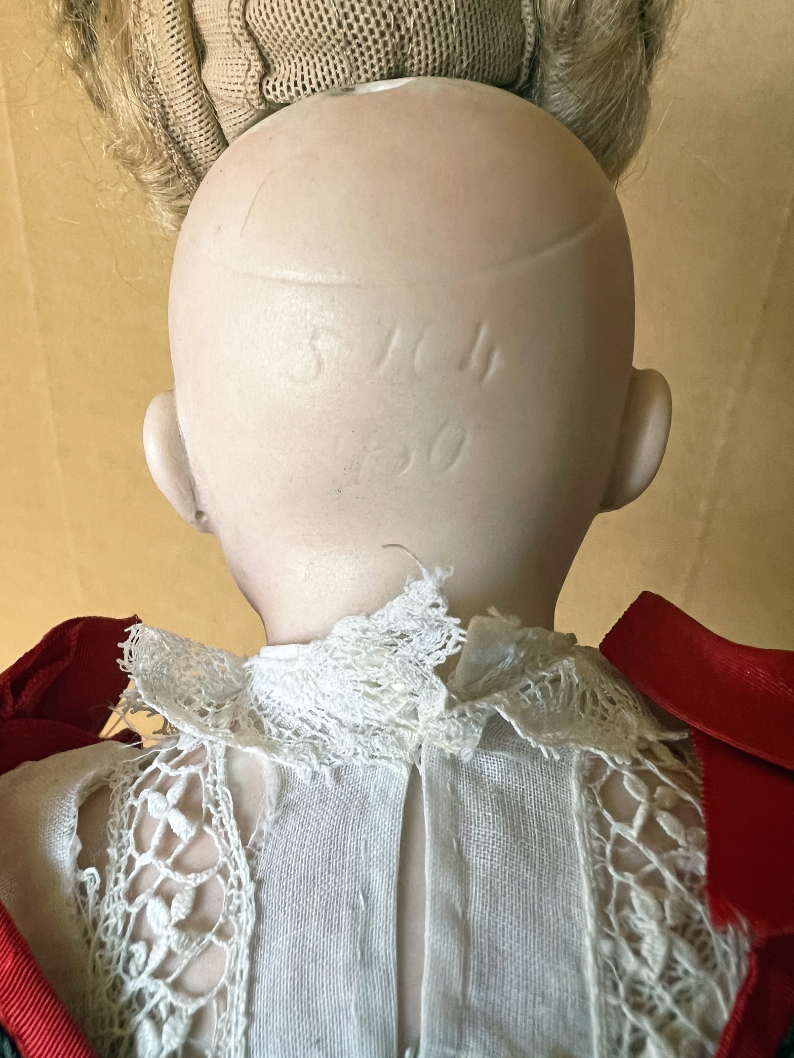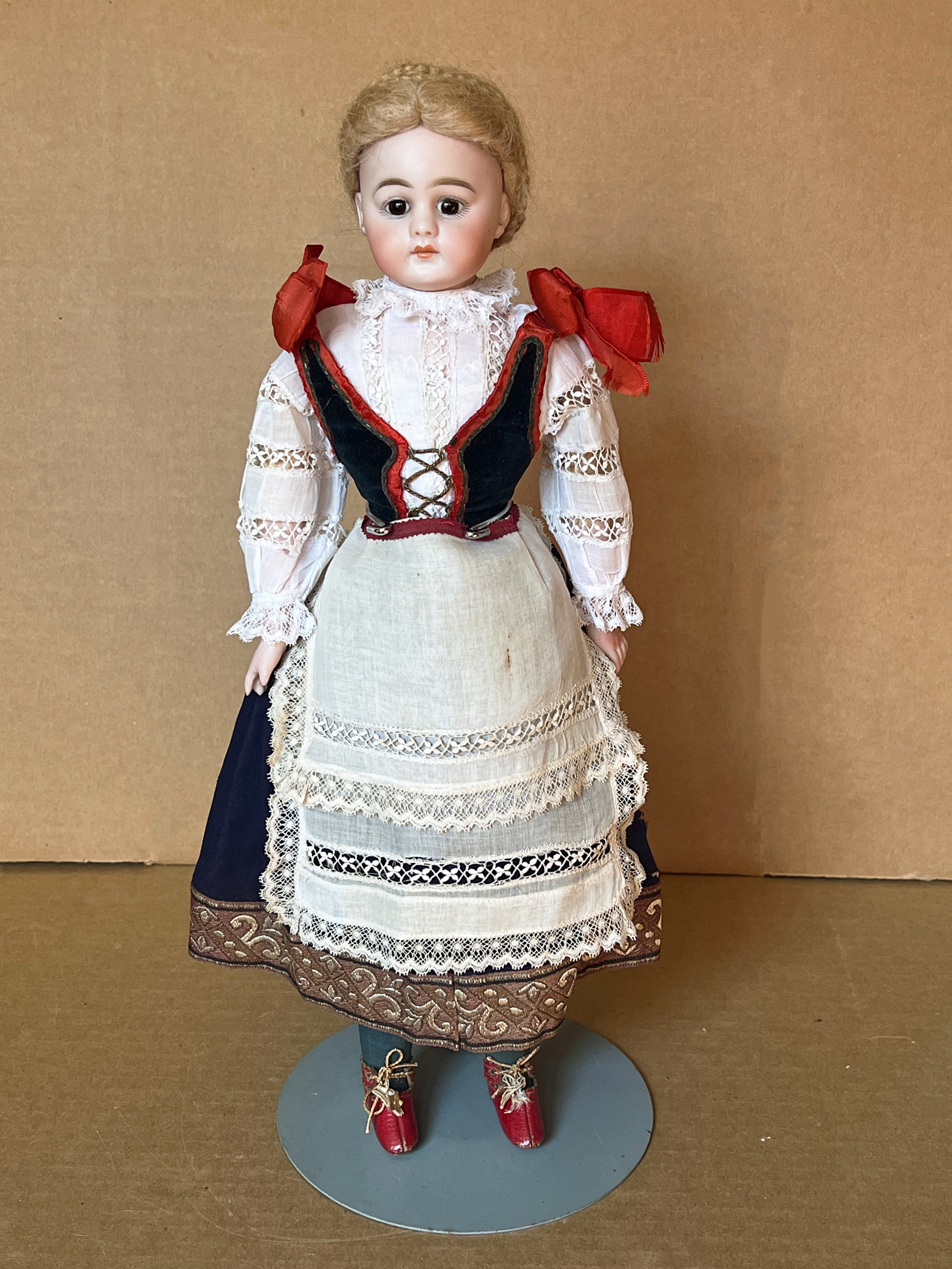 Most attractive 15” ( 38cm ) tall closed mouth shoulder head doll, circa 1890s, with incised marking back of head “ S&H 4 950 “. She has a rounded ( bald ) bisque domed head covered by a wonderful blond mohair wig ( not as old as the doll ) featuring center part and tight braids encircling the entire head. She has a closed mouth, brown fixed glass eyes, well painted lashes and brows, and delicately shaded lips. The original body is muslin covered cloth with sewn joints at shoulders, hips, and knees, and well sculped bisque forearms. The costume appears all- original representing an unknown European regional costume with black velvet vest with antique red ribbon bows at the shoulders, a dark blue wool skirt with fancy ribbon trim at bottom, a cotton and lace blouse, a gauze and lace apron covering front of skirt, antique underwear and antique red leather shoes. The “ 950 “ mold by Simon and Halbig has the exact facial features of their “ 949 “ model other than the 950 is a shoulder head whereas the 949 is a socket head, generally found on a jointed composition body. Most of clothing sewn around her and cannot be removed to show the body……………………….US$ 675.