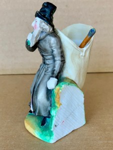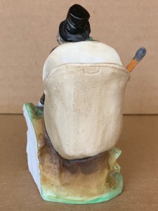 4” ( 10cm ) tall all bisque German match holder/striker in a well detailed image of an older man with long beard wearing tall hat, long coat and boots walking through a forest with a huge open ruck sack suspended over right shoulder to allow storage of matches with a ridged rough surface on lower left side to create the necessary friction to light a wooden match. No markings found but very well made!………………US$ 45.