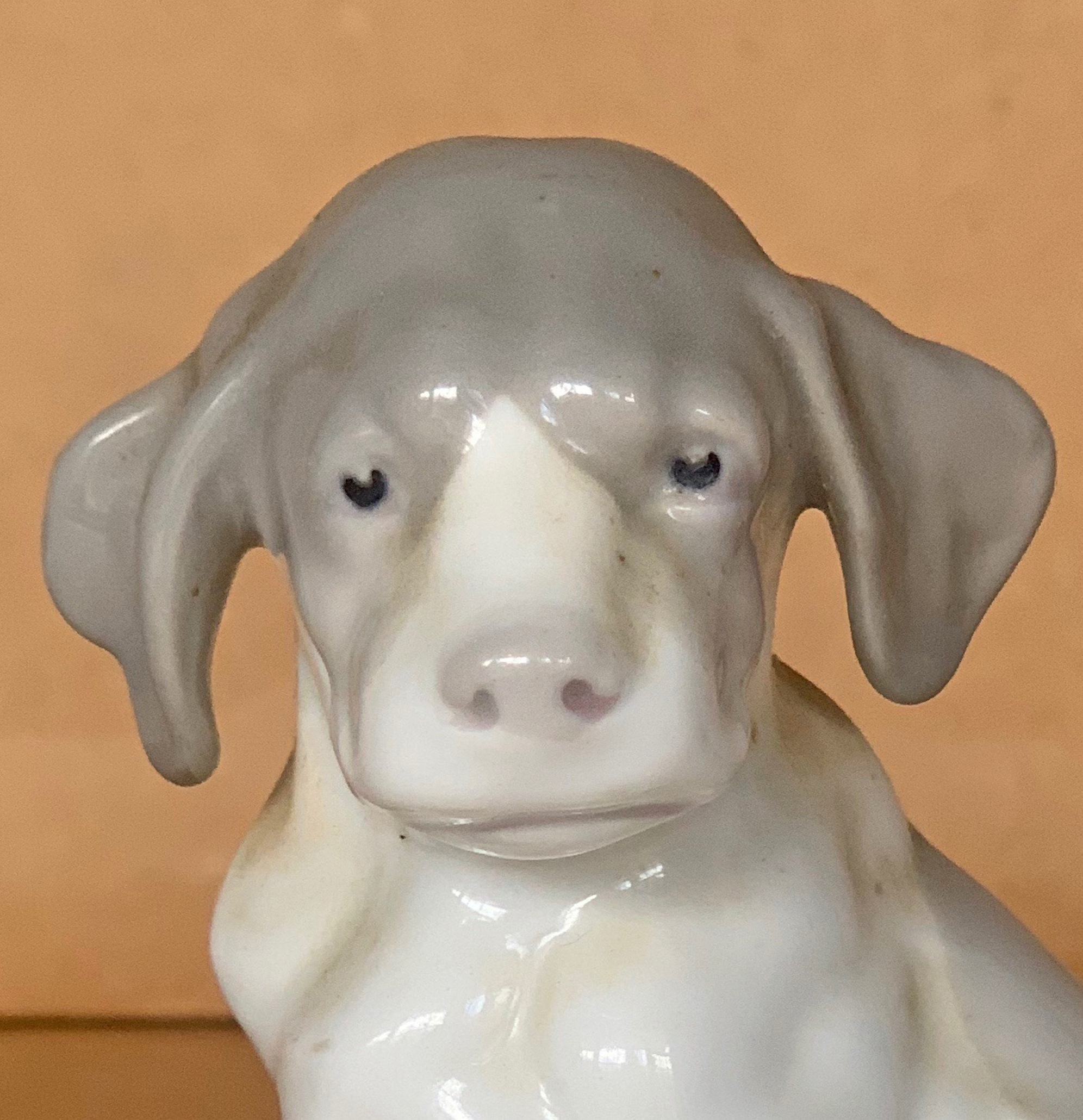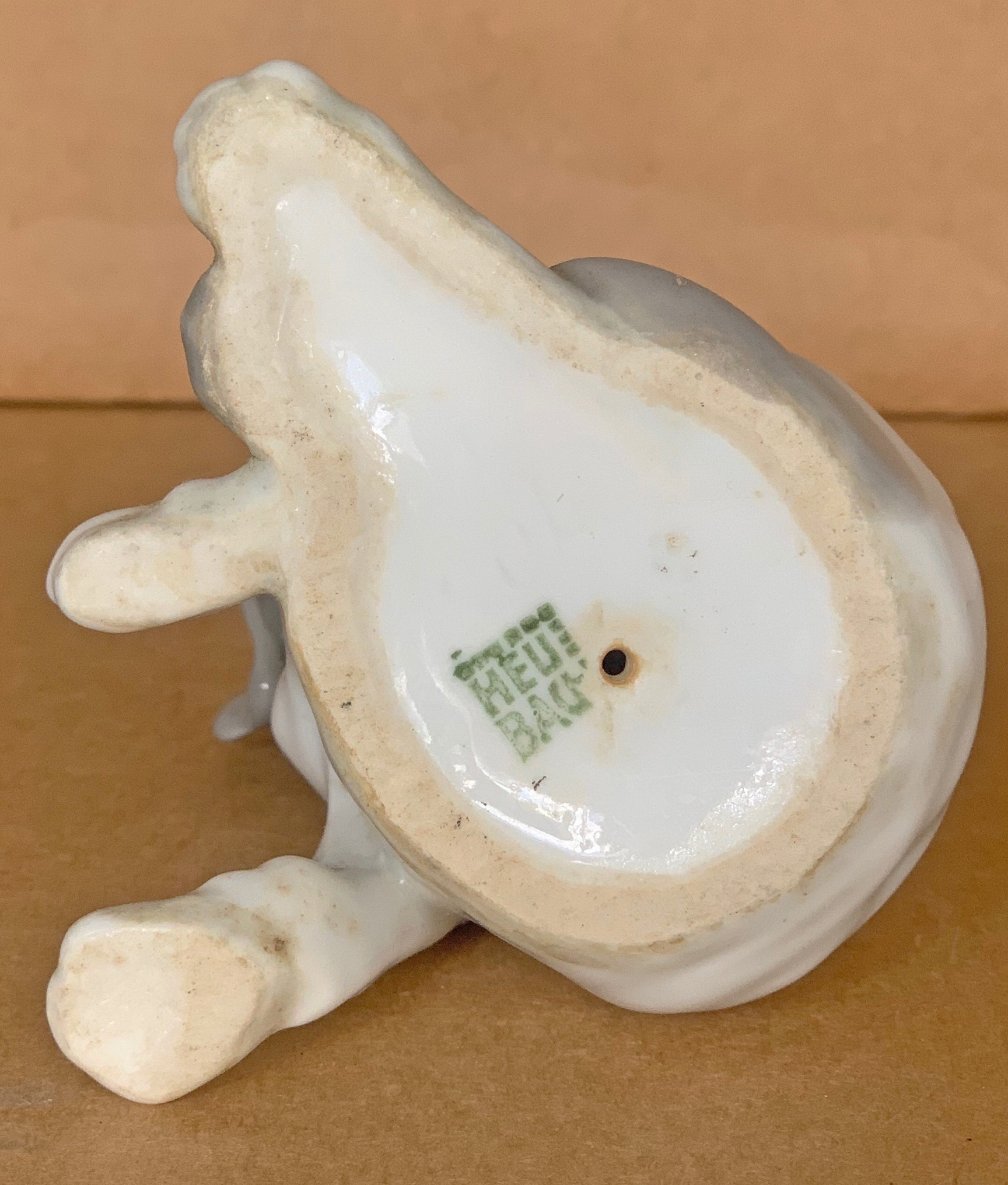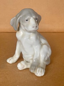 Seated 4 ½” ( 11cm ) tall seated glazed porcelain puppy with long ears with hind legs tucked underneath body and weight supported by outstretched right leg. Underneath the base is a green stamp “ HEUBACH ( square logo )”. …….US$ 75.