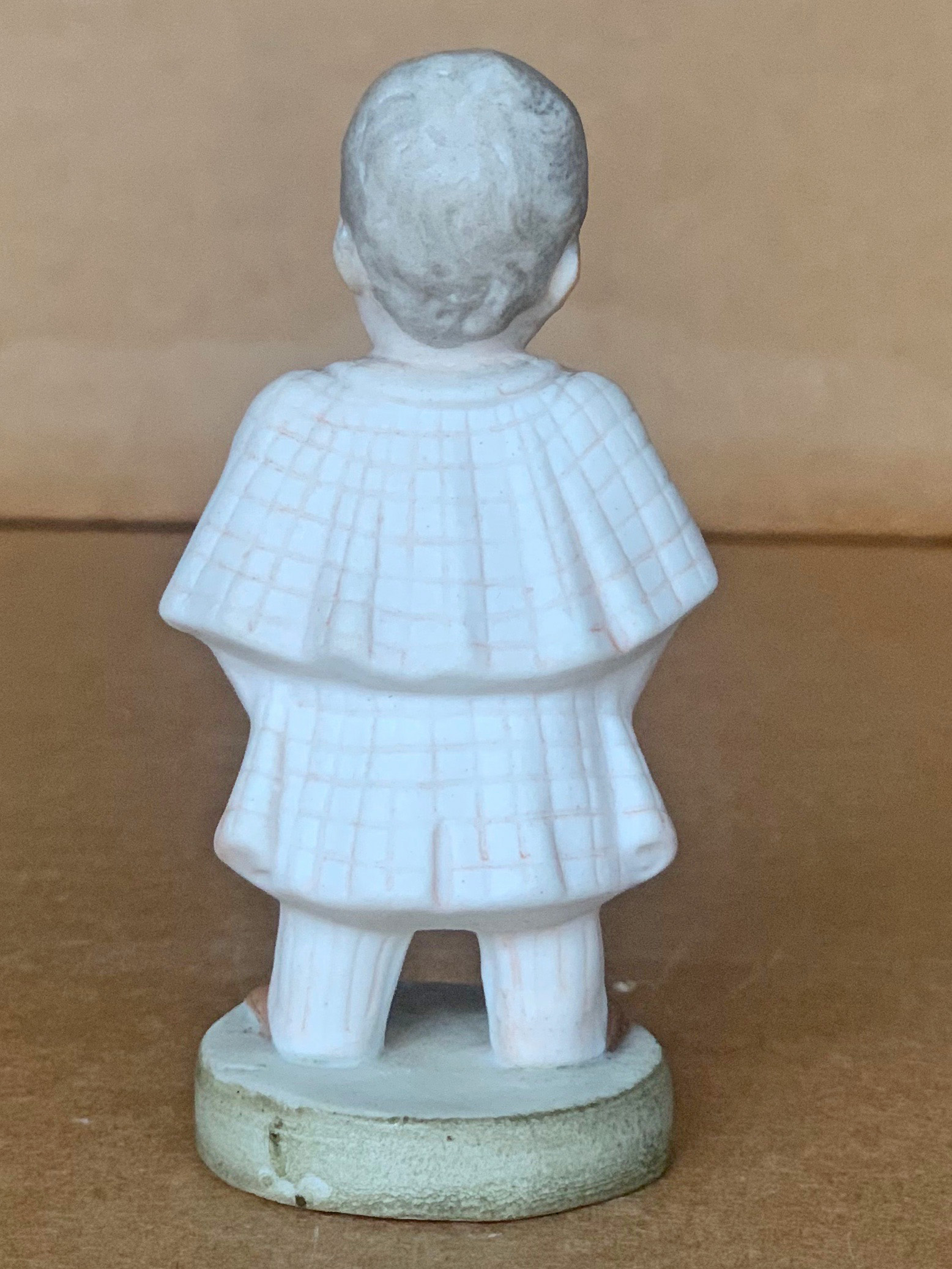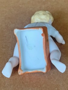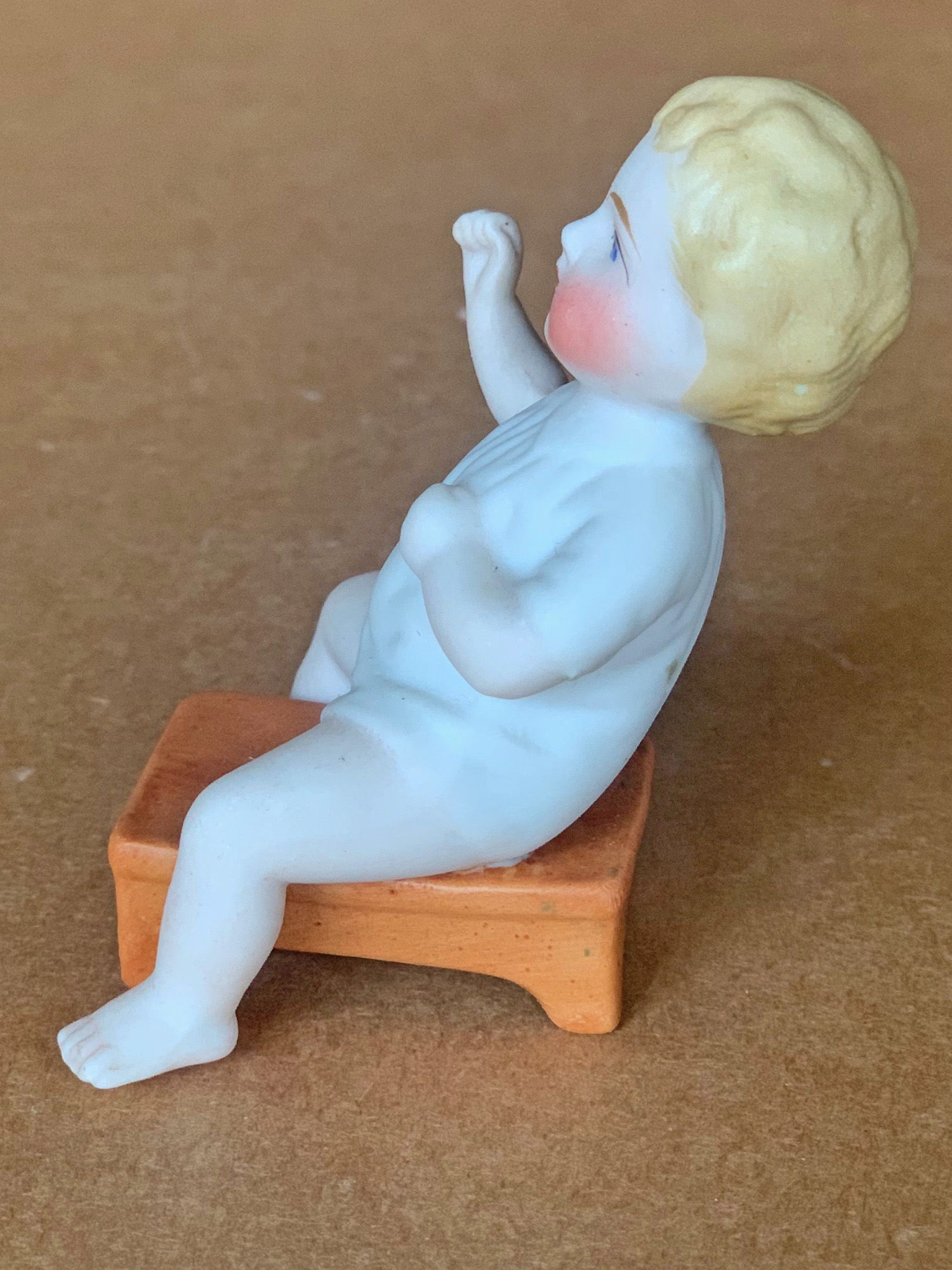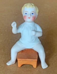 3”( 8cm ) tall seated small boy with nightshirt seated upon a footstool with legs dangling from sides with left arm pressed against body and right arm extended outward as if pretending to “ giddy-up “while playing “ horsey “. German, circa 1910… .US$ 45.
