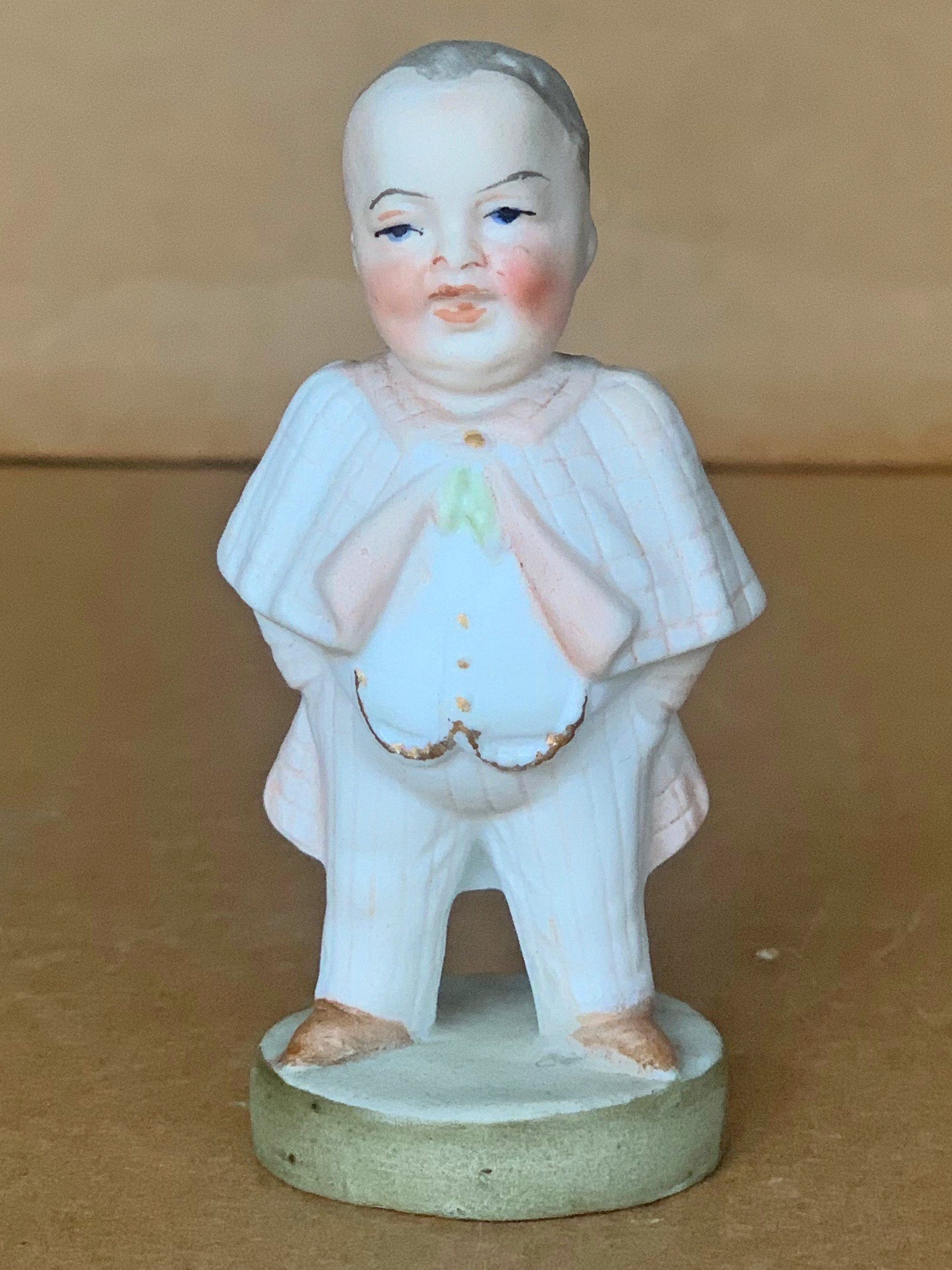 3 ½” ( 9cm ) tall ( including base platform ) of a young boy but dressed in ana adult-type suit with long pink tie and gold luster chain simulating the type associated with securing a pocket watch. German, circa 1910………………US$ 45.