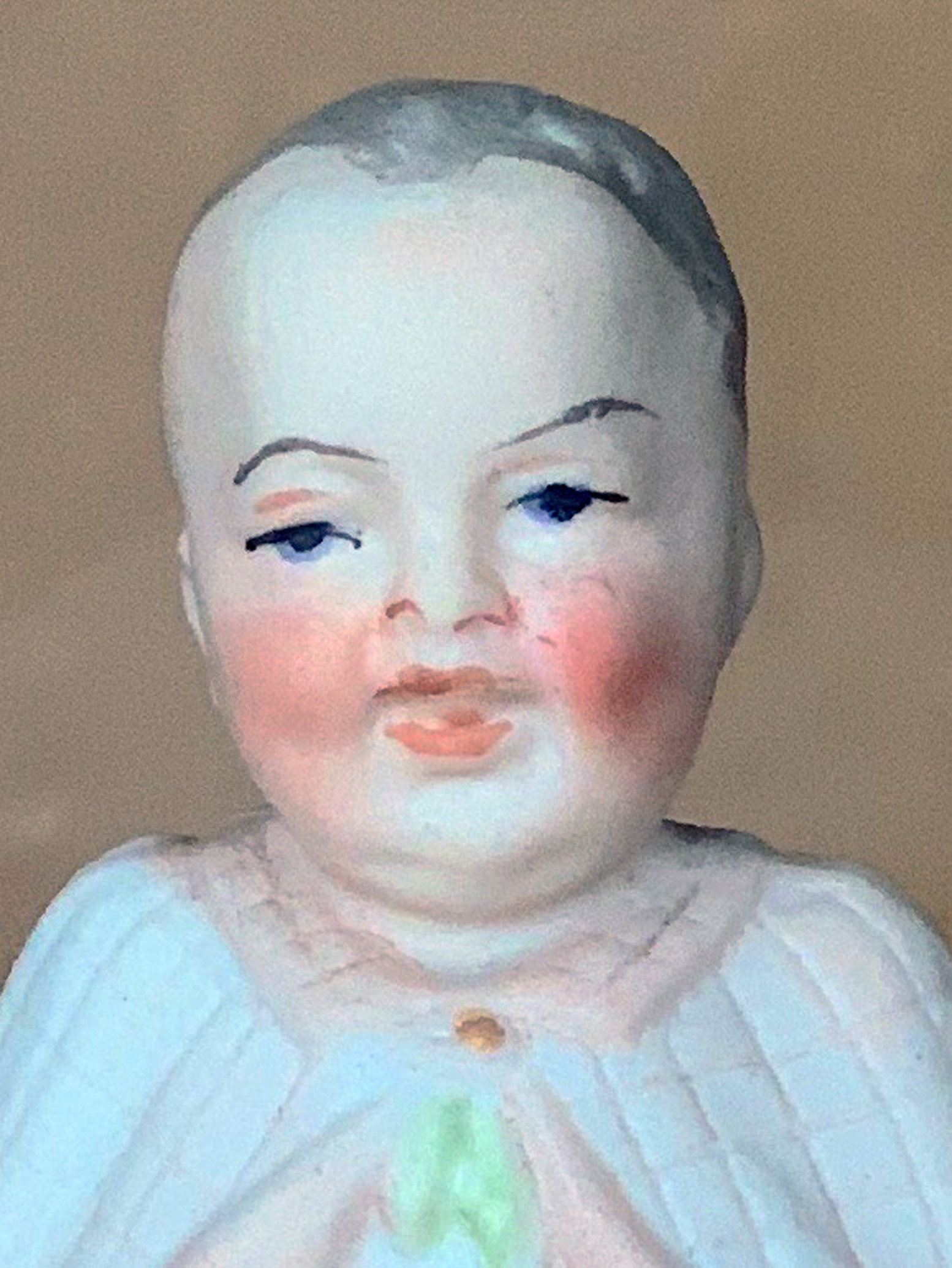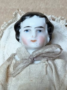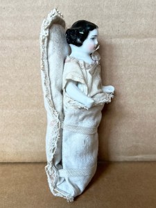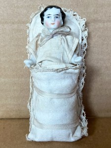 Wonderful 4 ½” ( 12cm ) all porcelain one piece figure, aka “ Frozen Charlotte “_type , with black curly hair, arms outstretched, bare feet, glazed surface except the back of legs and “ tush “ are matte white bisque only. She is cleverly presented in a white cotton and lace trimmed “ bunting “ outfit with a quilted outer layer. The white silk ribbon ties may be replaced but the oval look and appeal are indisputable! ……………………………………………………US$ 195.