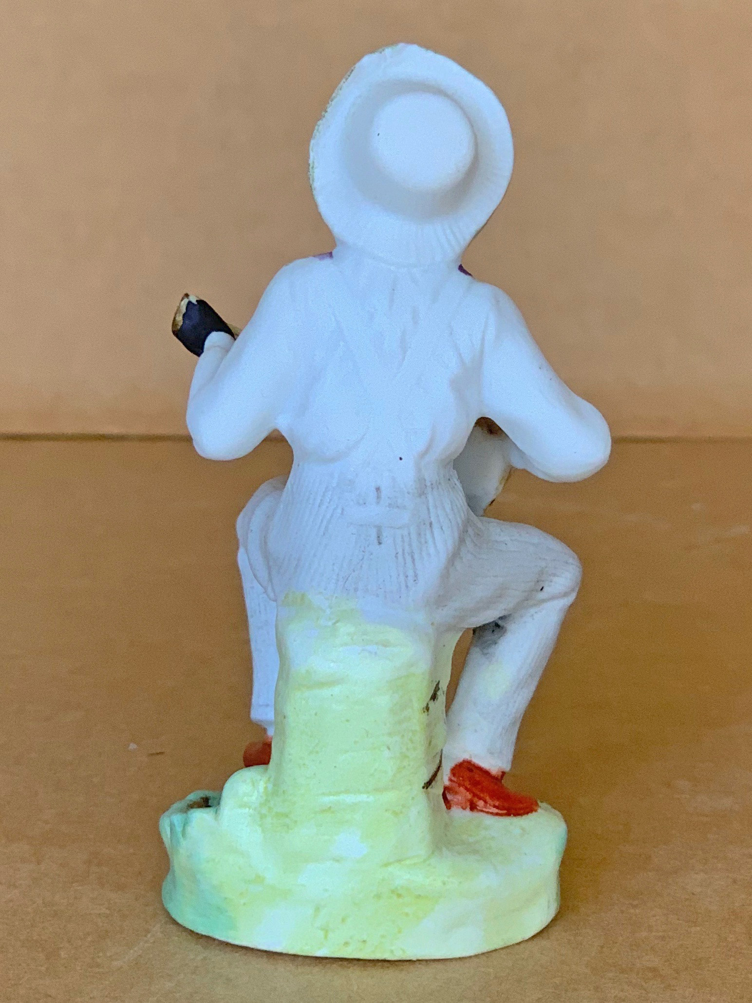4” ( 10cm ) tall all bisque figure incised on back of base “ 422 “ and portraying a banjo-playing minstrel sitting on the base of a tree stump. Excellent quality of German manufacture circa 1910……….US$ 45.