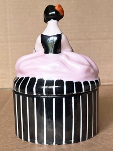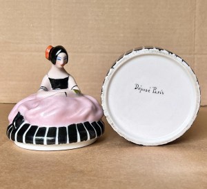 6 ½” ( 17cm ) French porcelain dresser container in the form of a seated young woman wearing a thin black strapped dress with tight black bodice but long and flowing pink skirt. In her tightly upswept long black hair that frames her face and covers her ears entirely, there is a large orange hair ornament. Painted across upper right arms are three concentric black arm bands and on upper left arm a singular similar one and another at the wrist area. She appears to have a red and green object in the right hand pressing against the lower left arm, perhaps a small floral corsage. The paint decoration underneath the skirt as well as the entire exterior portion of the lower part of the box is black with thin vertical white stripes that are perfectly aligned when in place. On the underside of the base there is a signature-like marking “ Depose Paris “. In overall very good condition and is of an unusual heavy weight………………………….US$ 175.
