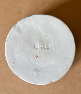 Unusual 5 ½” ( 13cm ) seated lady, obviously a woman of style and means, wearing a plum colored cape with matching cloche hat, seated on an object resembling the shape of a round hat box, legs crossed at the ankles above the low heeled shoes with gold luster highlights, wearing a pale green knee-length dress staring outward as to think of the proper wording of the letter she is about to prepare with paper and pen in hands. On base of bottom is incised “ 16420 Germany “, most likely Hertwig & Co. of Thuringia, circa 1920. In excellent condition with a thin delicate glaze covering the lady figure in particular…………………………US$ 195.