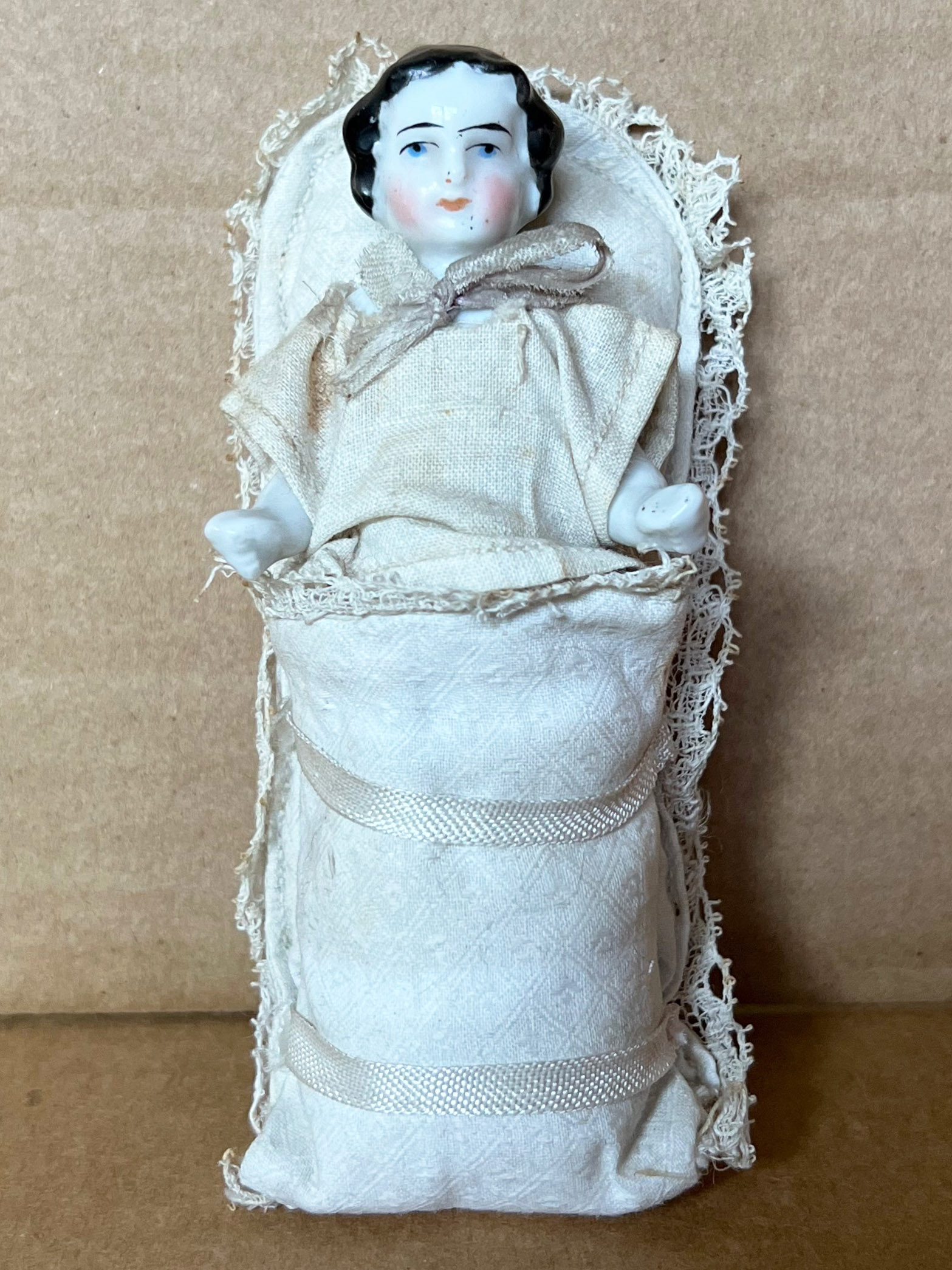 Wonderful 4 ½” ( 12cm ) all porcelain one piece figure, aka “ Frozen Charlotte “_type , with black curly hair, arms outstretched, bare feet, glazed surface except the back of legs and “ tush “ are matte white bisque only. She is cleverly presented in a white cotton and lace trimmed “ bunting “ outfit with a quilted outer layer. The white silk ribbon ties may be replaced but the oval lookand appeal are indisputable! ……………………………………………………US$ 325.