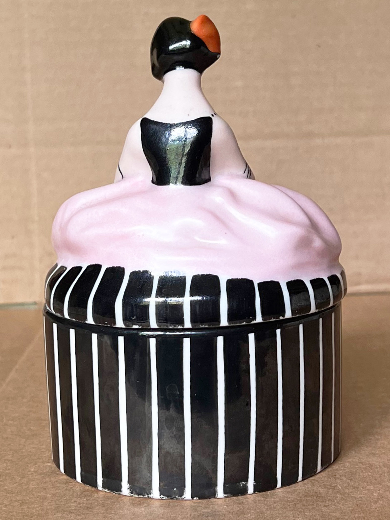 6 ½” ( 17cm ) French porcelain dresser container in the form of a seated young woman wearing a thin black strapped dress with tight black bodice but long and flowing pink skirt. In her tightly upswept long black hair that frames her face and covers her ears entirely, there is a large orange hair ornament. Painted across upper right arms are three concentric black arm bands and on upper left arm a singular similar one and another at the wrist area. She appears to have a red and green object in the right hand pressing against the lower left arm, perhaps a small floral corsage. The paint decoration underneath the skirt as well as the entire exterior portion of the lower part of the box is black with thin vertical white stripes that are perfectly aligned when in place. On the underside of the base there is a signature-like marking “ Depose Paris “. In overall very good condition and is of an unusual heavy weight………………………………………………….US$ 235.