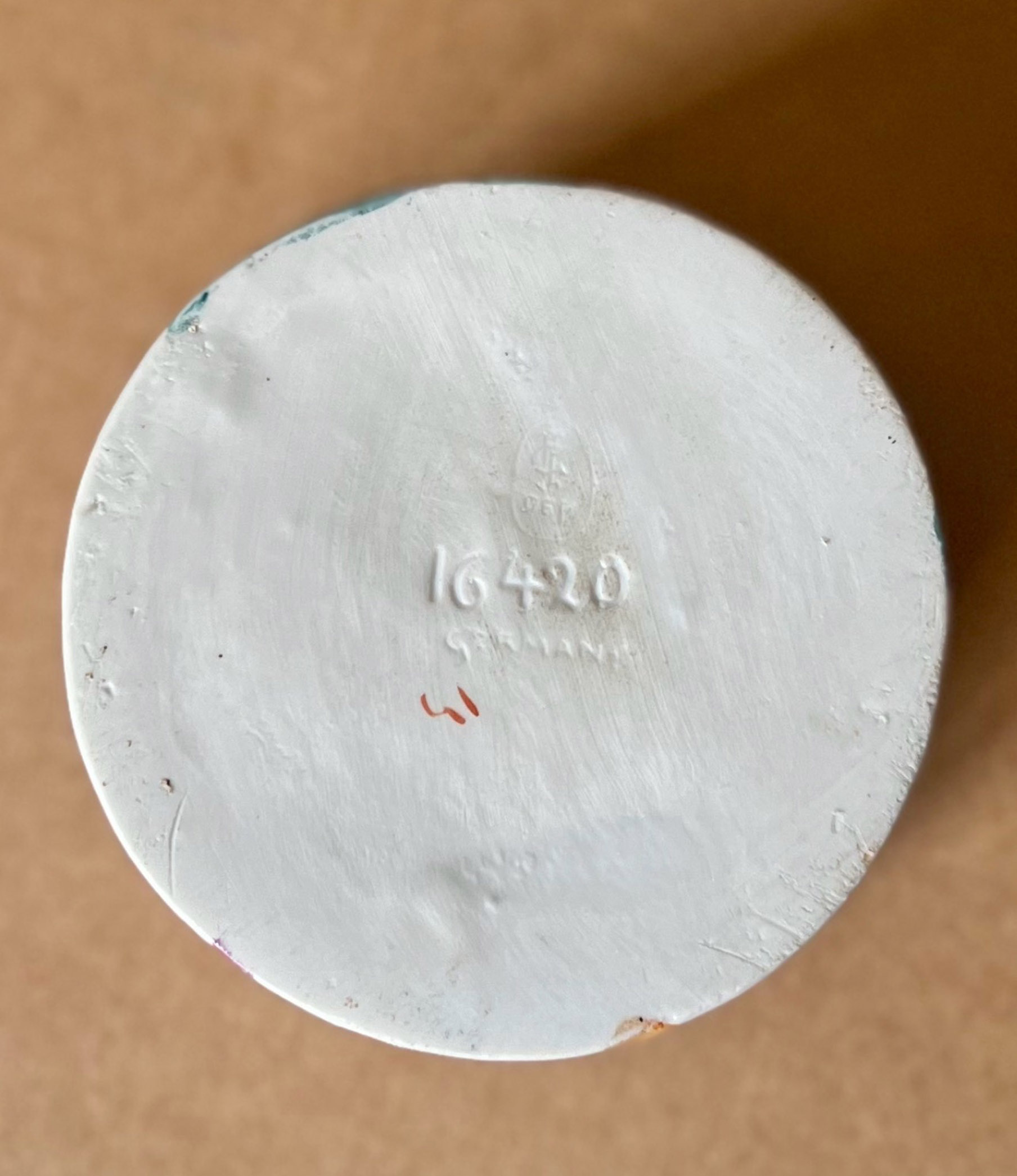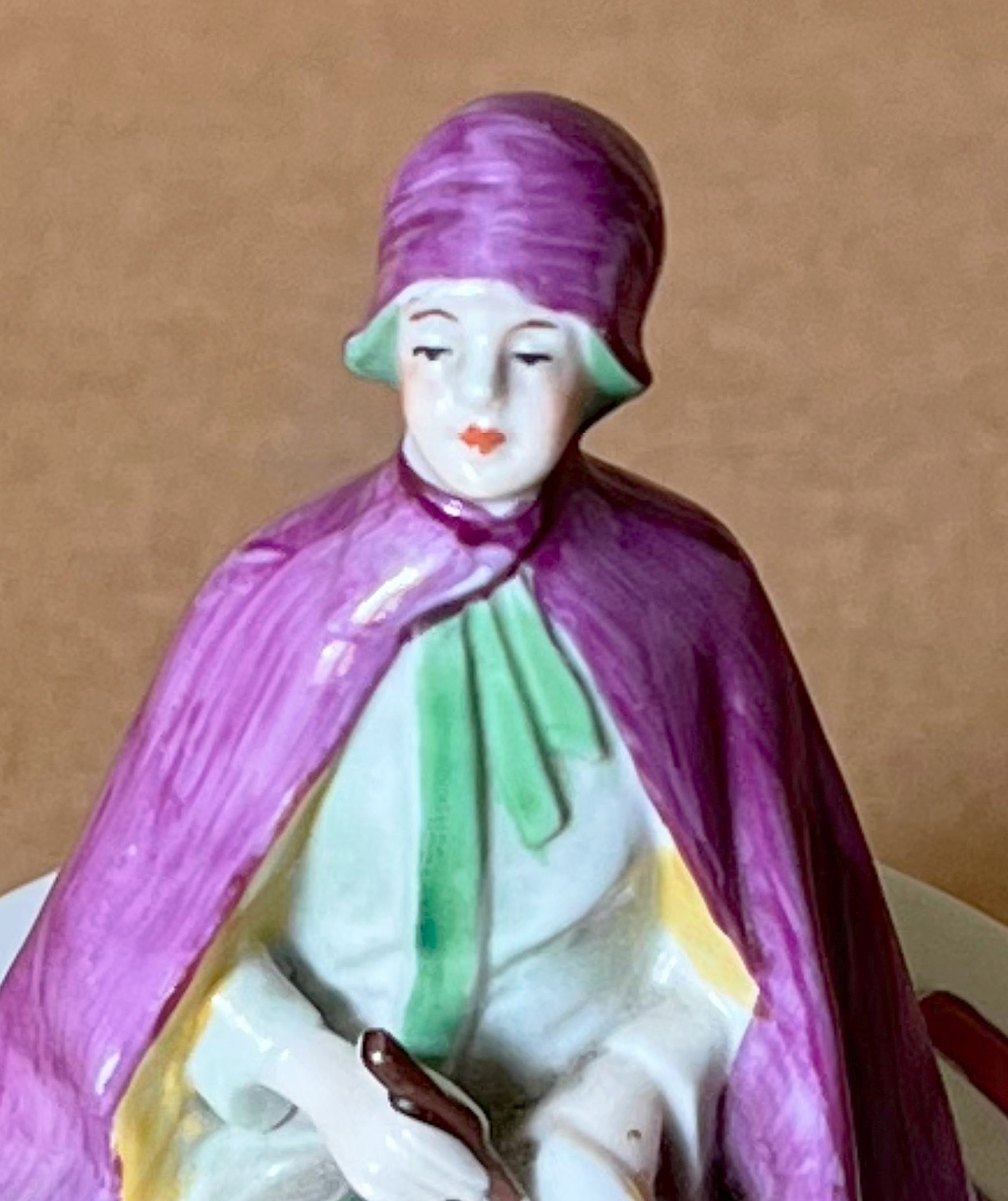 Unusual 5 ½” ( 13cm ) seated lady, obviously a woman of style and means, wearing a plum colored cape with matching cloche hat, seated on an object resembling the shape of a round hat box, legs crossed at the ankles above the low heeled shoes with gold luster highlights, wearing a pale green knee-length dress staring outward as to think of the proper wording of the letter she is about to prepare with paper and pen in hands. On base of bottom is incised “ 16420 Germany “, most likely Hertwig & Co. of Thuringia, circa 1920. In excellent condition with a thin delicate glaze covering the lady figure in particular……………………………………………US$ 235.