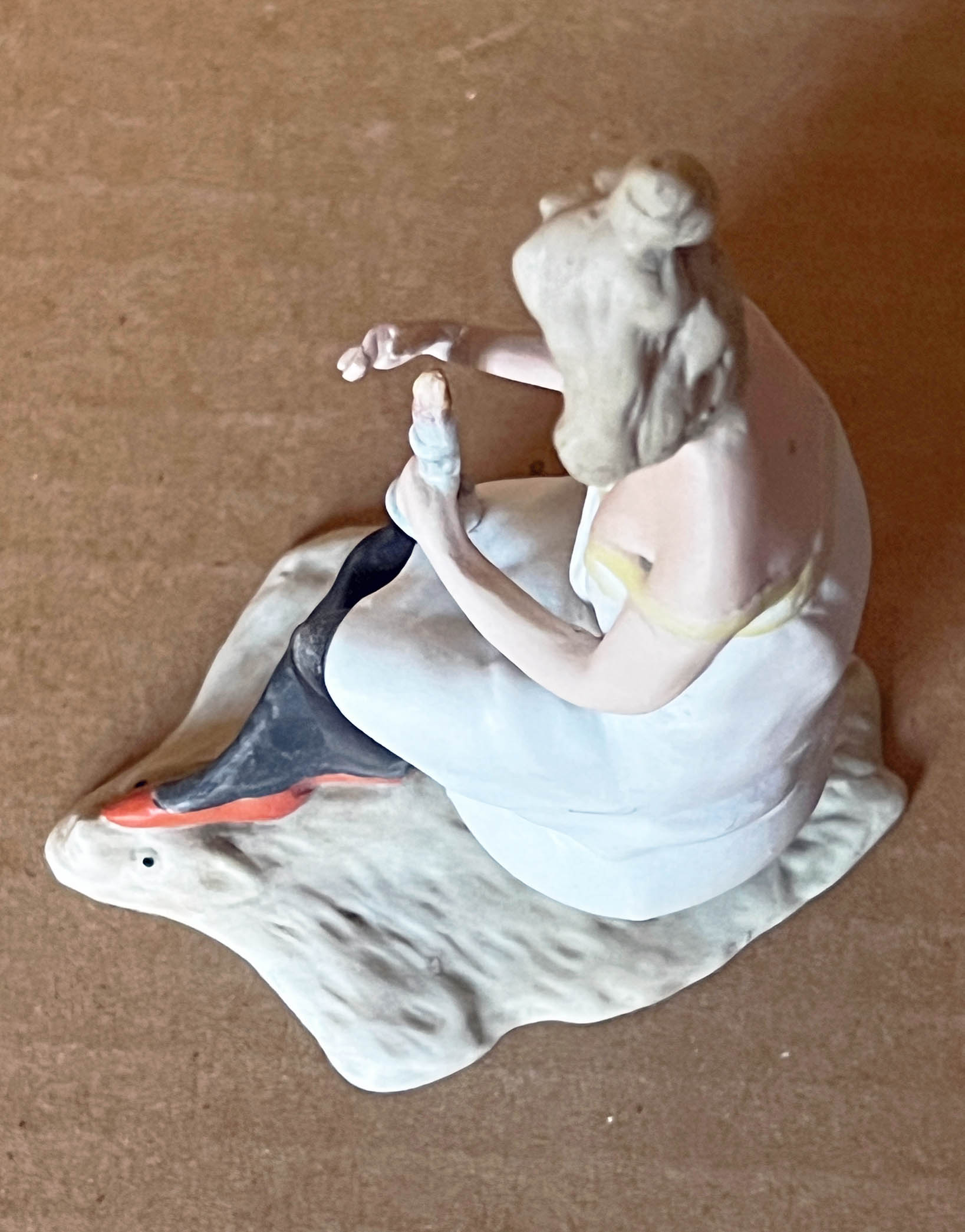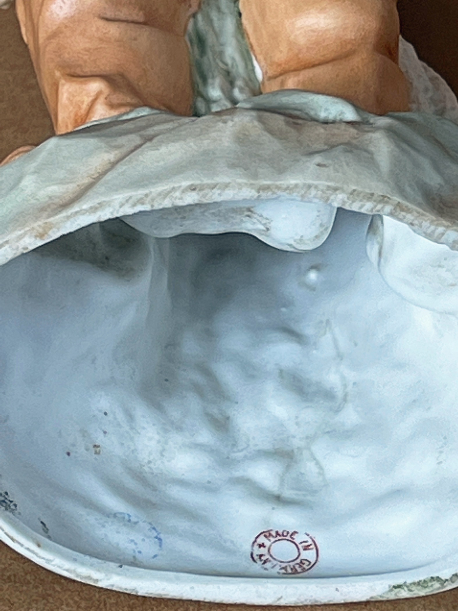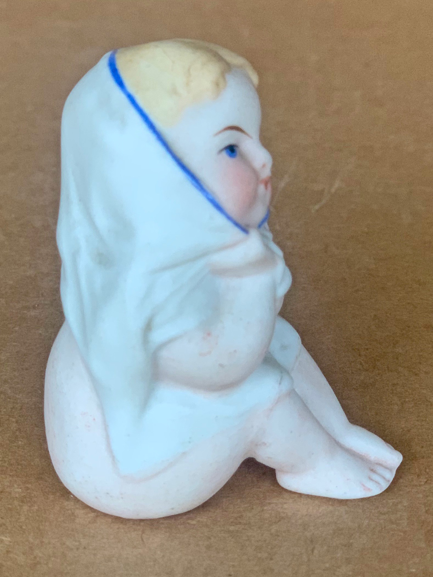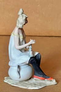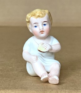 2 ½” ( 7cm ) tall seated little girl in crouched position pulling her nightshirt dress up over her head and tucked under chin as if she were a “ potty baby “-type figure yet there is no chamber pot nor any other object positioned below. German, circa 1910…US$ 45.