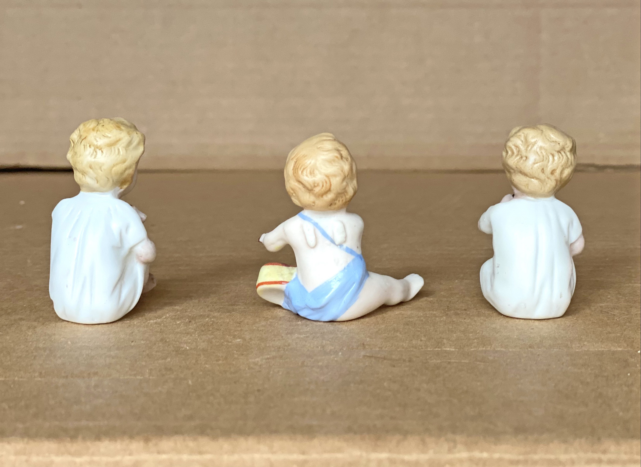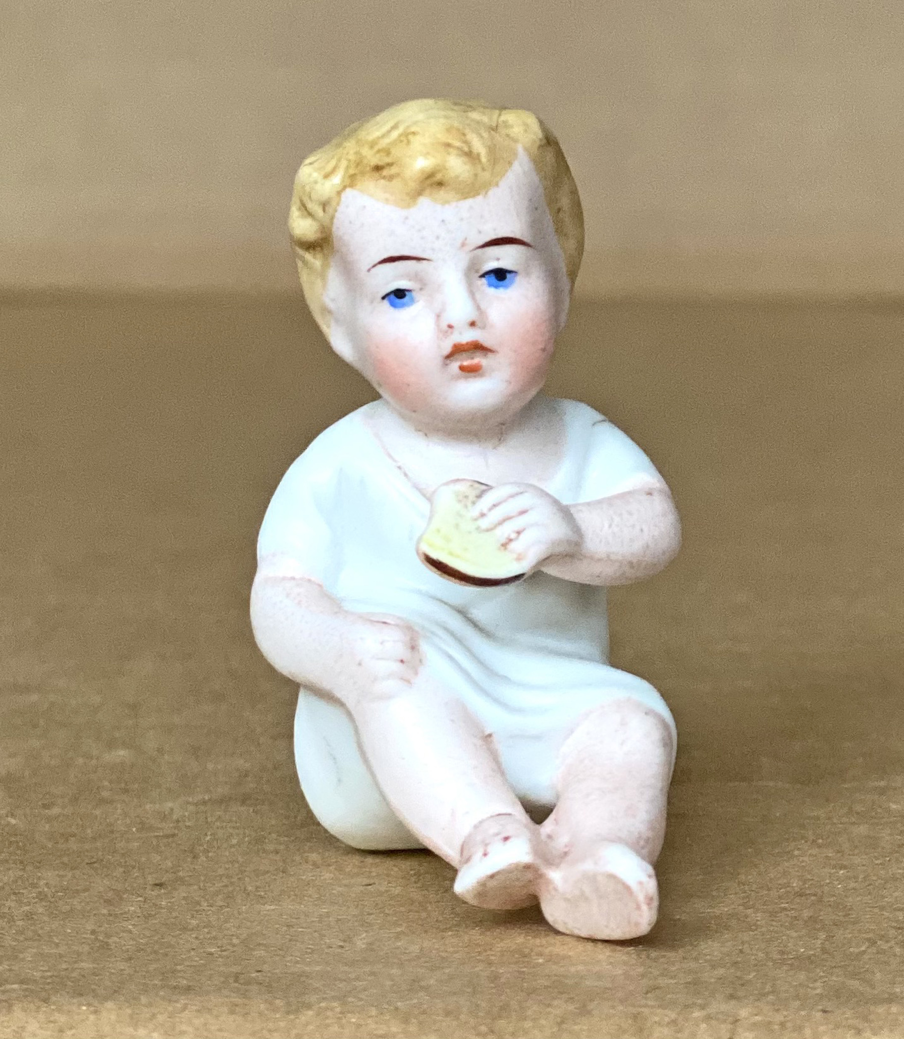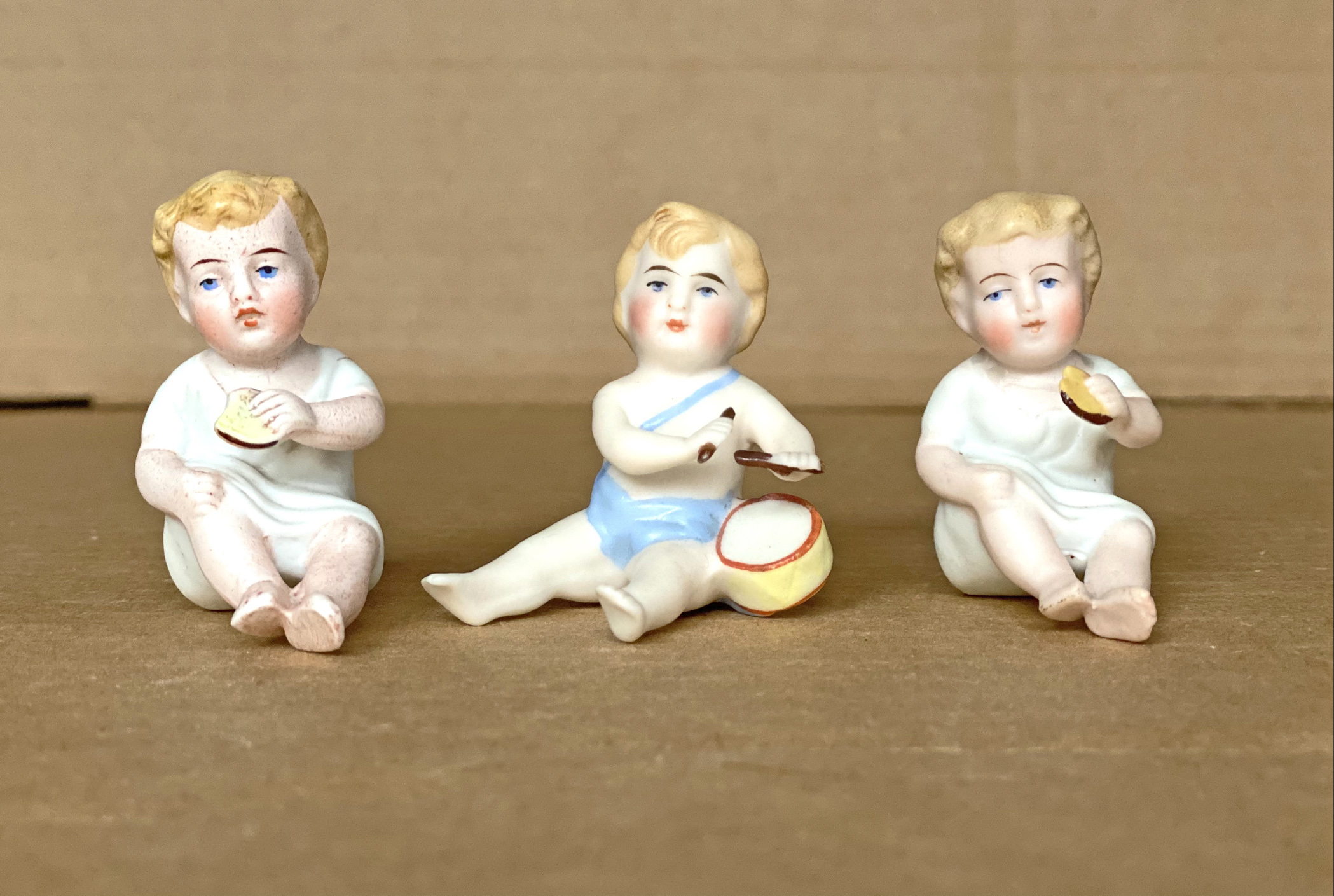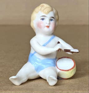 Lot of three diminutive ( 2”, 5 cm tall seated ) German bisque children of similar sizes and styles, all with molded blond hair, and legs extended forwards . Two are almost twins wearing nightshirts pulled up at the knees, with a partially eaten biscuit in outstretched left hand. If there is indeed any difference is that one has brighter coloring than the mate. The other child with legs fully extended has a drum at left hip and teo drumsticks in the hands, each at a unique angle. His costume is a blue undergarment with an attached diagonal shoulder strap crossing the chest in front. All in very good condition.……….US $ 135 ( The Lot )