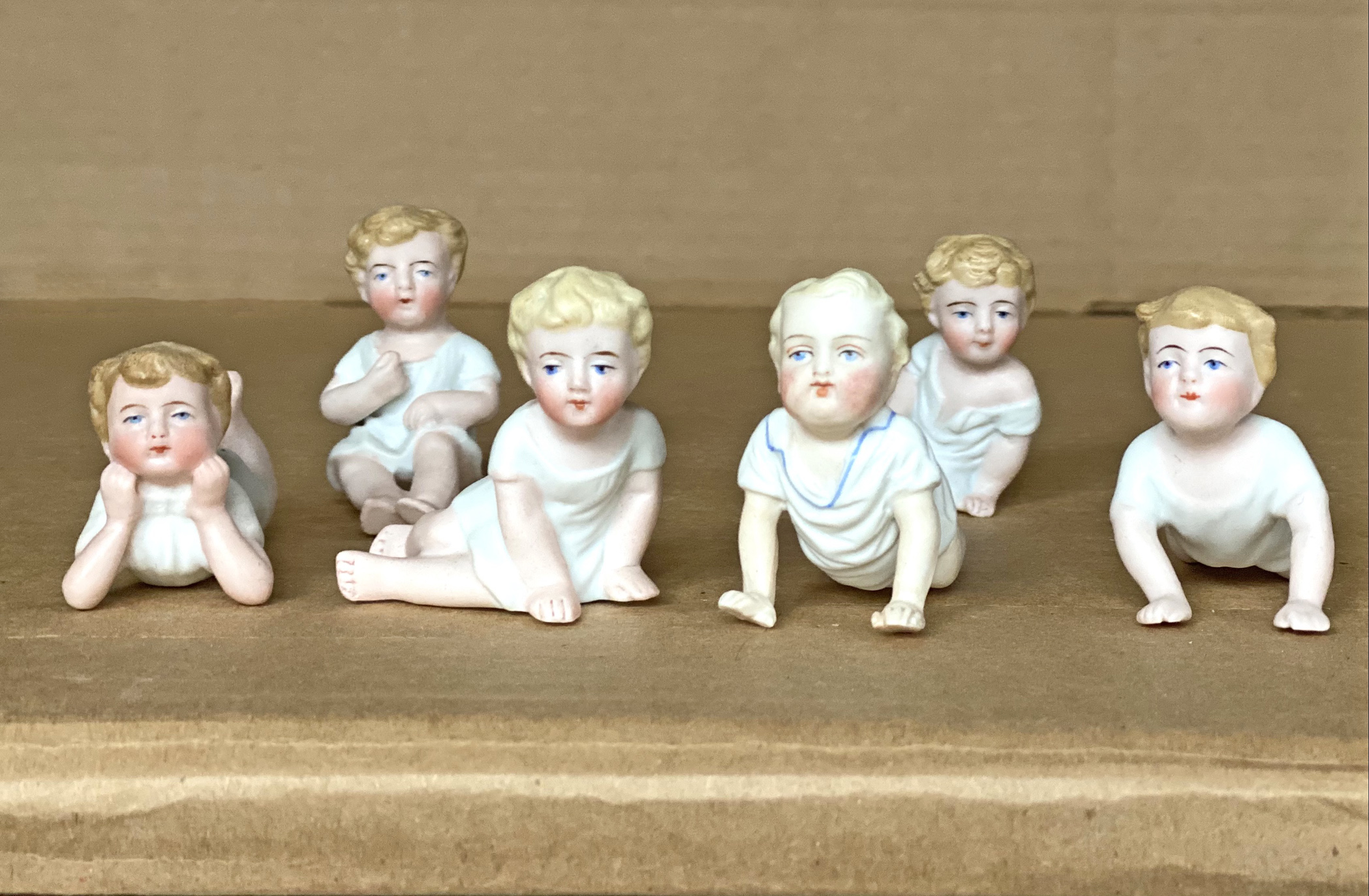 Lot of six small ( 2 ½”, 6 cm ) German bisque children, all of similar age and manufacture but each in a unique position, none of whom are standing. All wear white nightshirts, many with bare bottoms, five barefoot, and a lone wolf with one blue sock remaining. Two are crawling, three are seated, and the other resting his head on hands with shoulders on surface and legs doubled up and raised high in back. All in very good condition……………………………..US$ 195 ( The Lot )