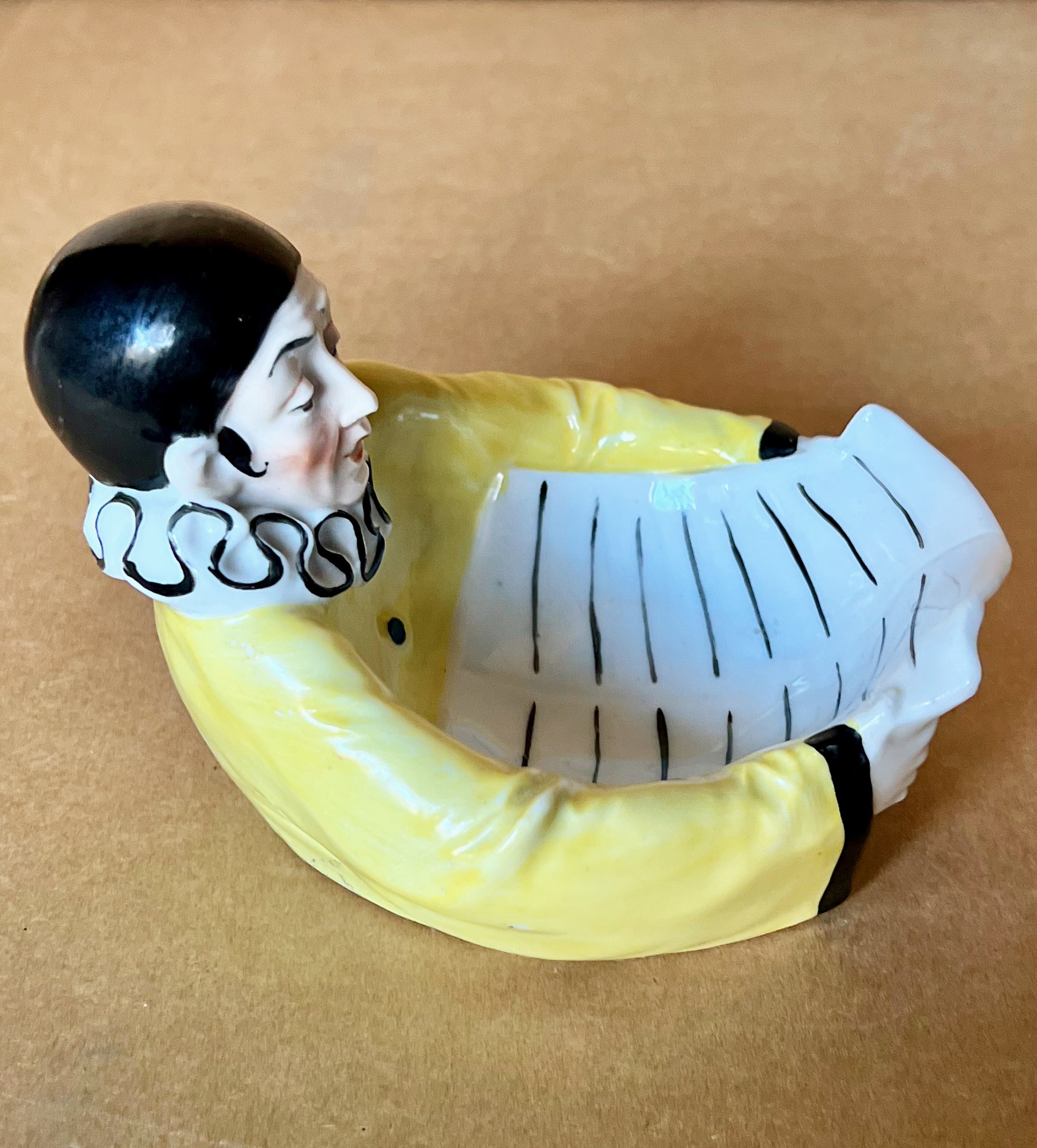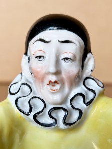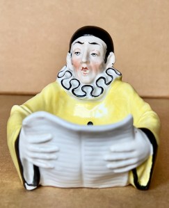 Comical presentation of a seated “ Pierrot”, mouth open, eyes gazing both forward and downward, with arms clutching what appears to be , at least from the outside front, to be a large piece of white paper. However, when turned to either side, and/or looking from the back, one observes straight black lines running horizontally left to right with a distinct space in the middle. As the paper lacks any musical notes he may not be singing, possibly reading aloud a newspaper either to himself to anyone who might listen. .Pierrot wears his required costume with long sleeves, black cap, side curls, and huge ruffled collar. The seated figure is 4” ( 10cm ) tall, 5 ½” ( 13cm ) front to back, and 4” ( 10cm ) wide. It is very heavy, in very good condition, and is impressed on base underneath “ 23044 “ and also has an impressed logo that appears to be that of a crown and also the letter “S”. ( Perhaps Goebel ? ). Very good condition and designed with great imagination and sense of humor……………………US$ 115.
