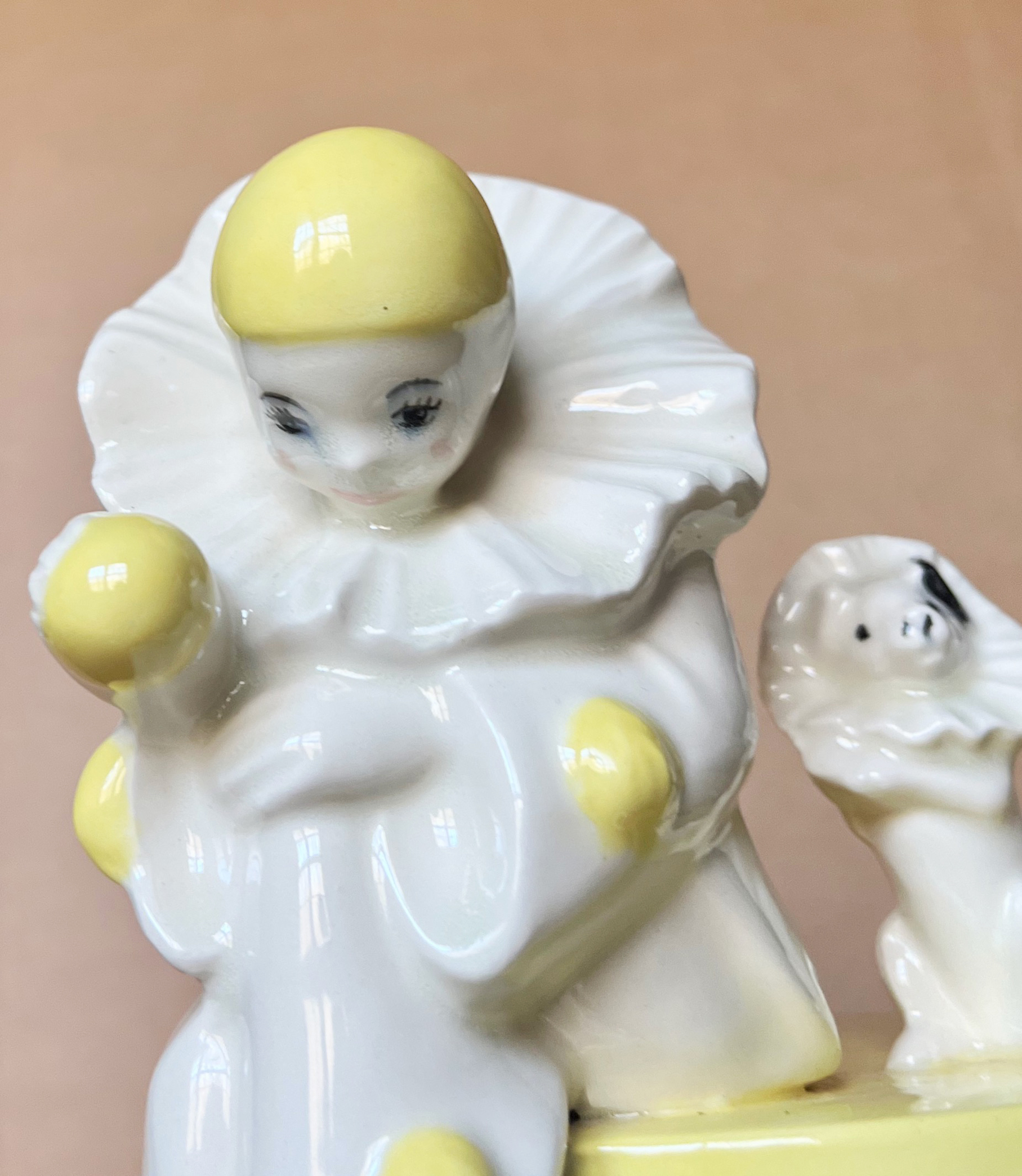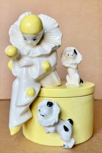 Large ( 8 ½”,21cm tall; 7 ½”, 19cm wide across base ), and heavy porcelain covered box with charming subject matter of a Pierrot ( albeit a very young one ), seated on the edge while of the lid of the box but with most of his body overhanging the edge of the lid, while two accompanying dogs play with him. Each also wears the “Pierrot-style “ ruffled collar, one seated along side of the boy on box lid, the other applied to the side of the base as if he were jumping upward. In the boy’s right hand there is a round object much like that found on his costume yet appears to be a ball which the lower dog may be attempting to “catch “. There are no marks found anywhere on the object but style is not typically German, more likely German, Italian, or Eastern European. Although no identifying marks, and although most likely not Lenci, it does have a few of the characteristics of Lenci porcelain and pottery products rendered in the 1920s and 30s’. Inside the boy’s dangling right leg there is an irregularity and a slight bit of open space not visible from the front nor when box pieces in place and fully aligned. A most appealing piece illuding innocence and frivolity!………….US$ 135.