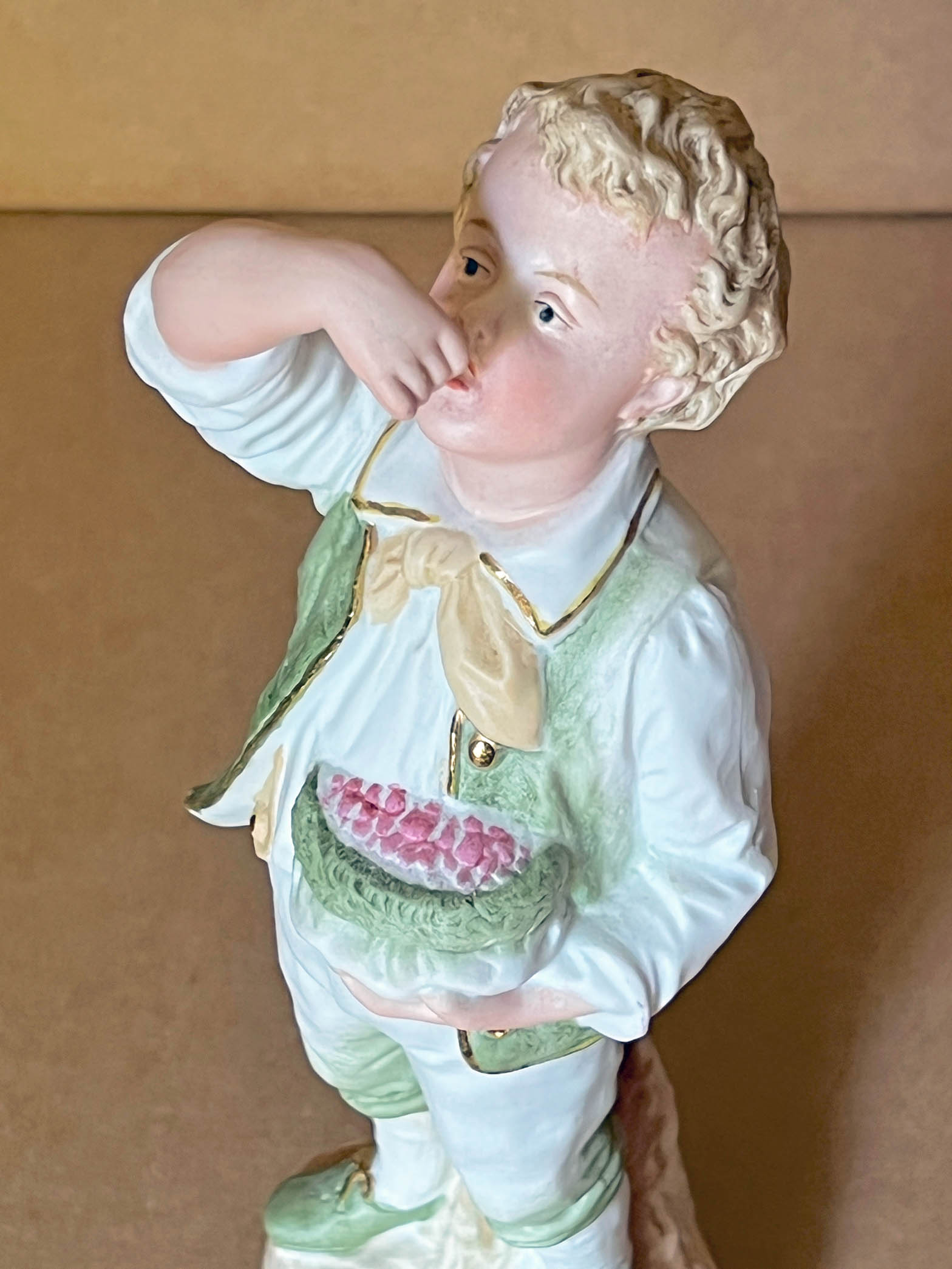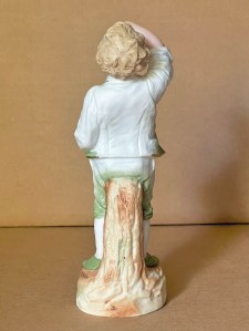 10” ( 26cm ) seldom found Gebruder Heubach figure of a young boy holding a bag of cherries in his left hand with right arm raised with a few in that hand about to put into his mouth as he looks slightly upward. The pale green color is the principle highlight base running all through the piece with some areas much lighter and in other areas such as the front of the vest, knees, and shoes much darker. Gold luster trim is found throughout as an accent feature on buttons, edging of jacket and collar, and shoelace ties. No markings on outside although in interior there is a red stamp “ Made In Germany “ contained within a circle, a recognized Heubach labeling technique, as well as at least 2 incised numbers are completely indistinguishable. Condition very good with no obvious problems. ………………………………..US$ 95.