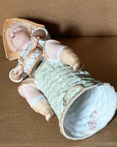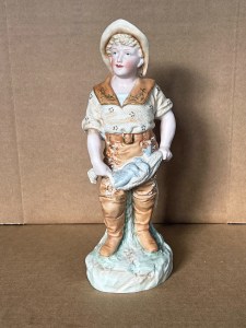 Seldom found 12 ½” ( 32cm ) Gebruder Heubach elaborately designed and decorated boy “ fisherman “, clasping between his hands a fishing net ( that also drapes alongside his left side and all around his body in back) with his “ catch “ ensnared. His clothing consists of a wide brimmed decorated cap, knee-length fishing boots allowing him to wade into water, a shirt with wide brimmed open collar with sprig design gold luster, a wide high-waist leather belt with well- modeled buckle. He is standing on a base designed to replicate a forest environment with a tree stump in back. Inside the figure near the base are a blue G Heubach logo stamp, as well as a circular red stamp reading “ Made in Germany “, also a known G Heubach registration marking. On left side of head where his curly blond hair meets the top of the ear this is a minor surface loss of bisque but is very insignificant yet necessary to divulge to any prospective buyer…US$ 75.