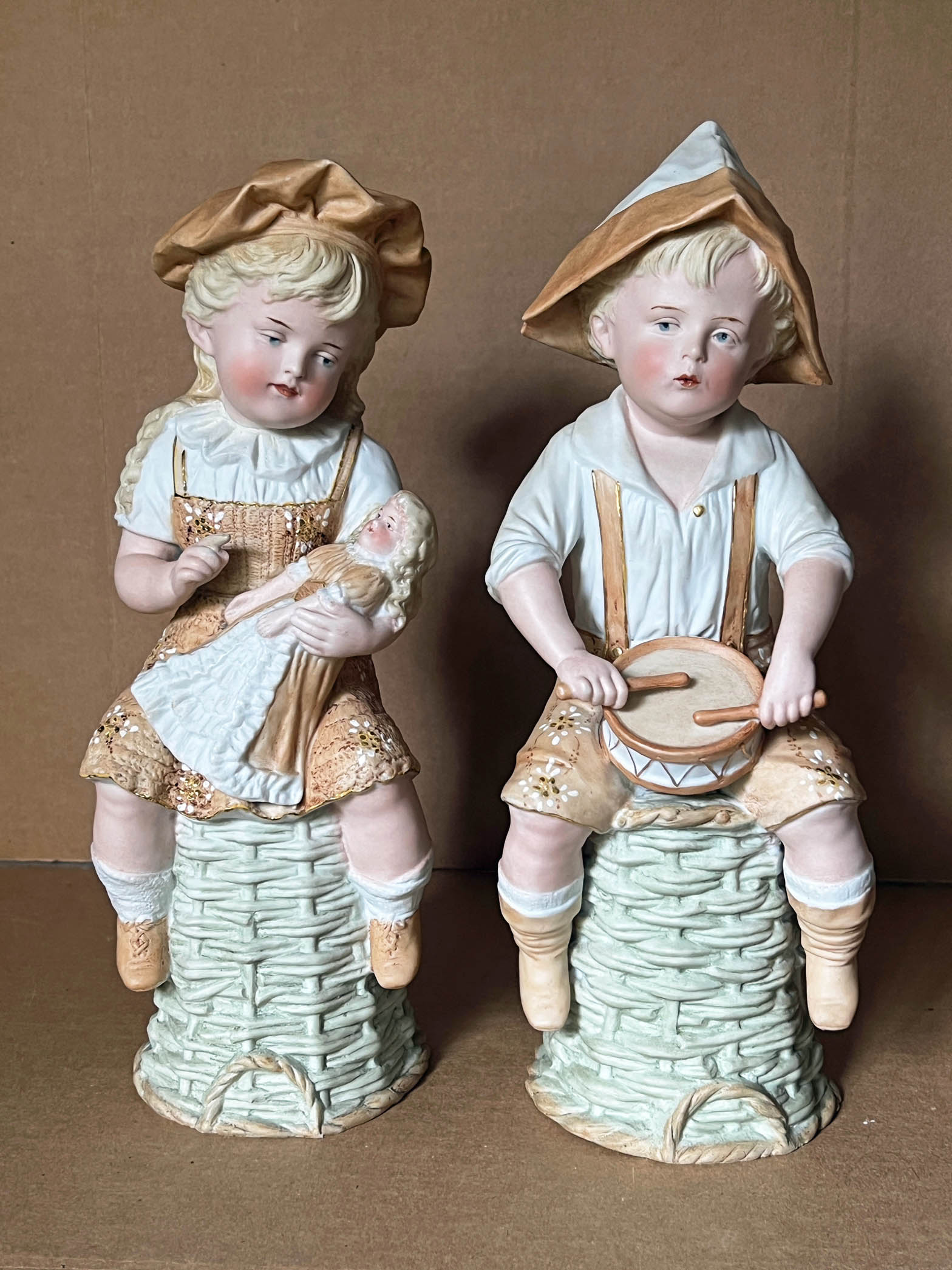 Lovely and hard to find pair of 12” ( 31cm) tall Gebruder Heubach all bisque figurines, circa 1900, of seated boy and girl, she holding her beloved dolly in her left arms, and he, with drumsticks in hands playing a drum positioned on his lap and secured between his thighs. She wears a beret-style cap and he a pointed two-toned hat with sharp outer edges much like found on those constructed by folded paper or newspaper. Both the girl’s pinafore and the boy’s knee-length trousers have floral design and gold luster decoration throughout. The “ stools “ on which they position themselves are meant to be of wicker, or perhaps more accurately, wicker baskets turned upside-down and sitting on the flat bases. Regardless, they are meticulously designed and executed with both having red Heubach stamps inside the bases exhibiting the GH “ fan mark “ , and “ made in Germany “. She has an old well-restored index finger pointed at her dolly as she is apparently giving instruction; he only a minor “ flea bite “ of a flake at bottom edge of base. Rare individually and even rarer as an original and designated pair……………………US$ 235 ( The Pair )