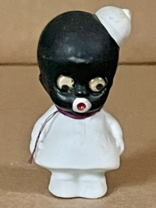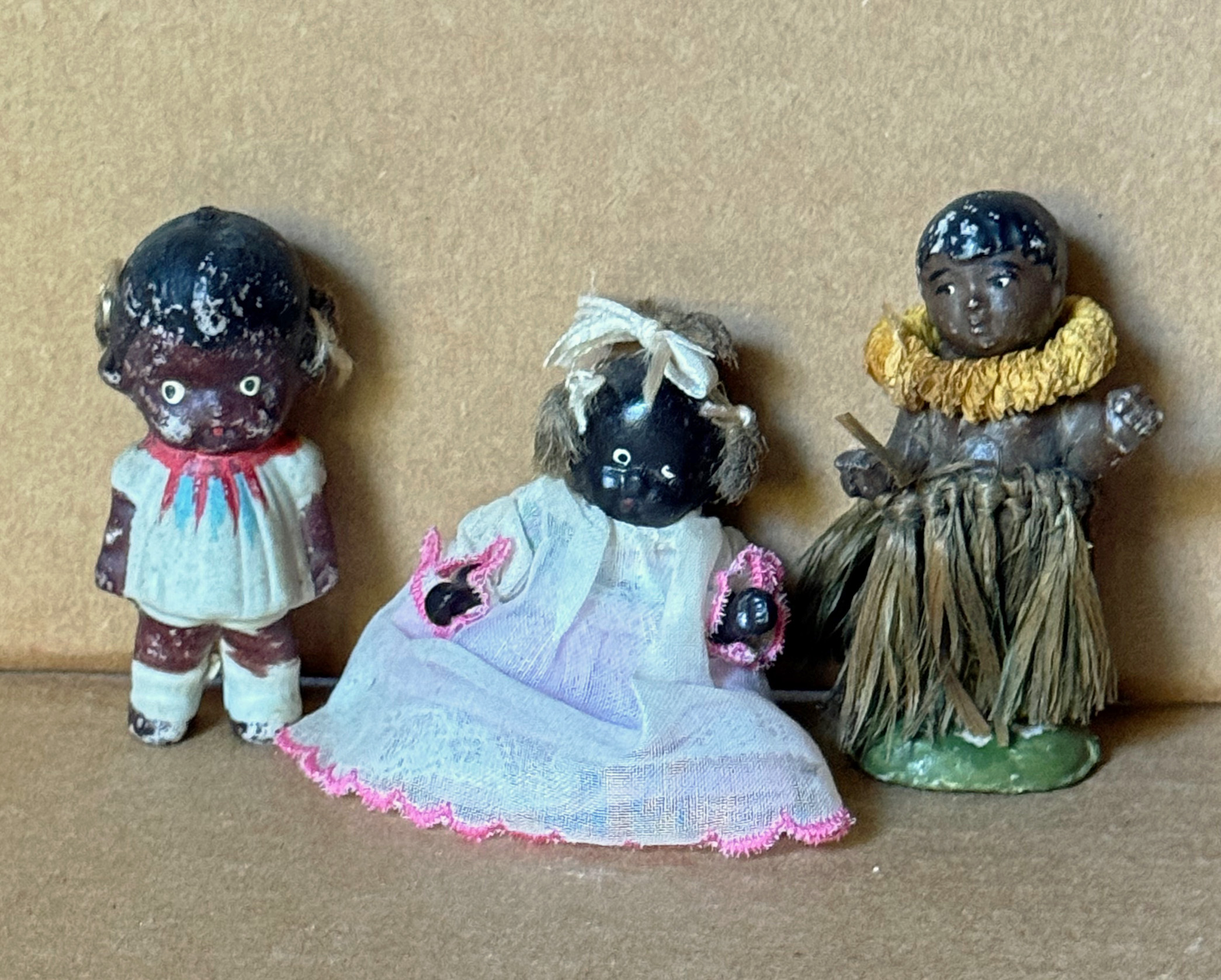 Lot of three small painted black all bisques. For those not acquainted with the “ painted bisque “ term , it indicates the paint was applied AFTER the bisque was fired, hence when you see some paint wear on two of the three this explains why. Two are one- piece figures with no articulation. One resembles a little girl with sad eyes, and molded and painted short dress. The other represents a Hawaiian ( or some other remotely related “ South Pacific ‘ Island Girl ‘ “with a lei covering her neck and an ankle-length “ grass “-skirt permanently affixed. The third represents a baby with painted features and three tufts of faux “ hair “ inserted in holes on top of and both sides of head. She has both jointed bisque arms AND legs, and is well attired in an all- original white gauze infant dress with pink trim and underwear. All unique, but all special!…………………..US$ 49 ( Lot of Three )
