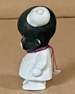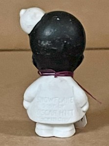 Charming 3” ( 7.5cm ) one-piece all bisque figure portraying the comical figure of “ Snowflake “. Although with no articulation, he does have “floating “ googly eyes created by have non-fixed pupils, firmly secured behind glass curved “lenses “, so as the figure is moved/shaken, the eyes change positions accordingly resulting in “ googly “-like ( both eyes looking to same side ), straight ahead, or “ crossed “ ( both inward ) appearances.He has hands in both pockets, a round open mouth with red center, eyes “ wide open “, black painted bald head and molded ears , and a small white cap with tiny visor perched precariously on left of head, miraculously defying gravity. On back of the coat, he is fully incised “ SNOWFLAKE copr. OSCAR HITT Germany “. ( And YES, the same Oscar Hitt that designed one of the rarest of all bisque head googly dolls!! )…………………………………..US$ 95.